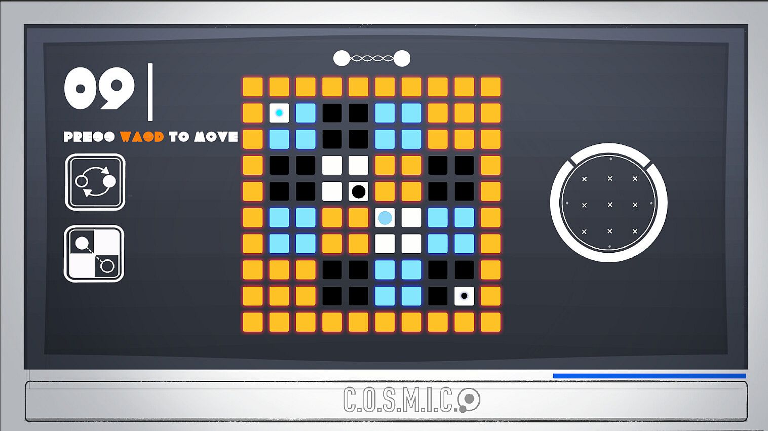 The player hacks the device to obtain clues in the form of puzzles. The puzzles allow the player to control two entangled particles with different spin directions, which will move in different directions. The player needs to make full use of the mechanism to get them to the specified location. Solved puzzles can light up stars on the panel to advance the plot.