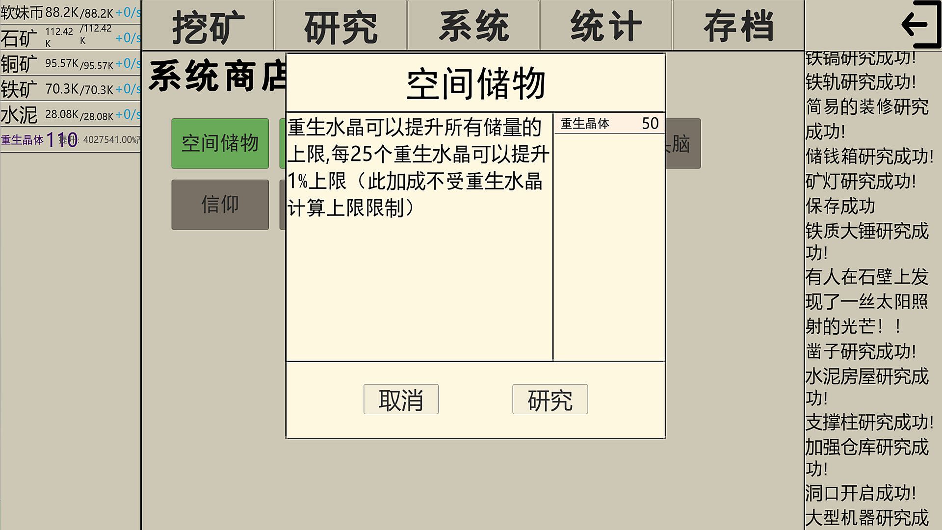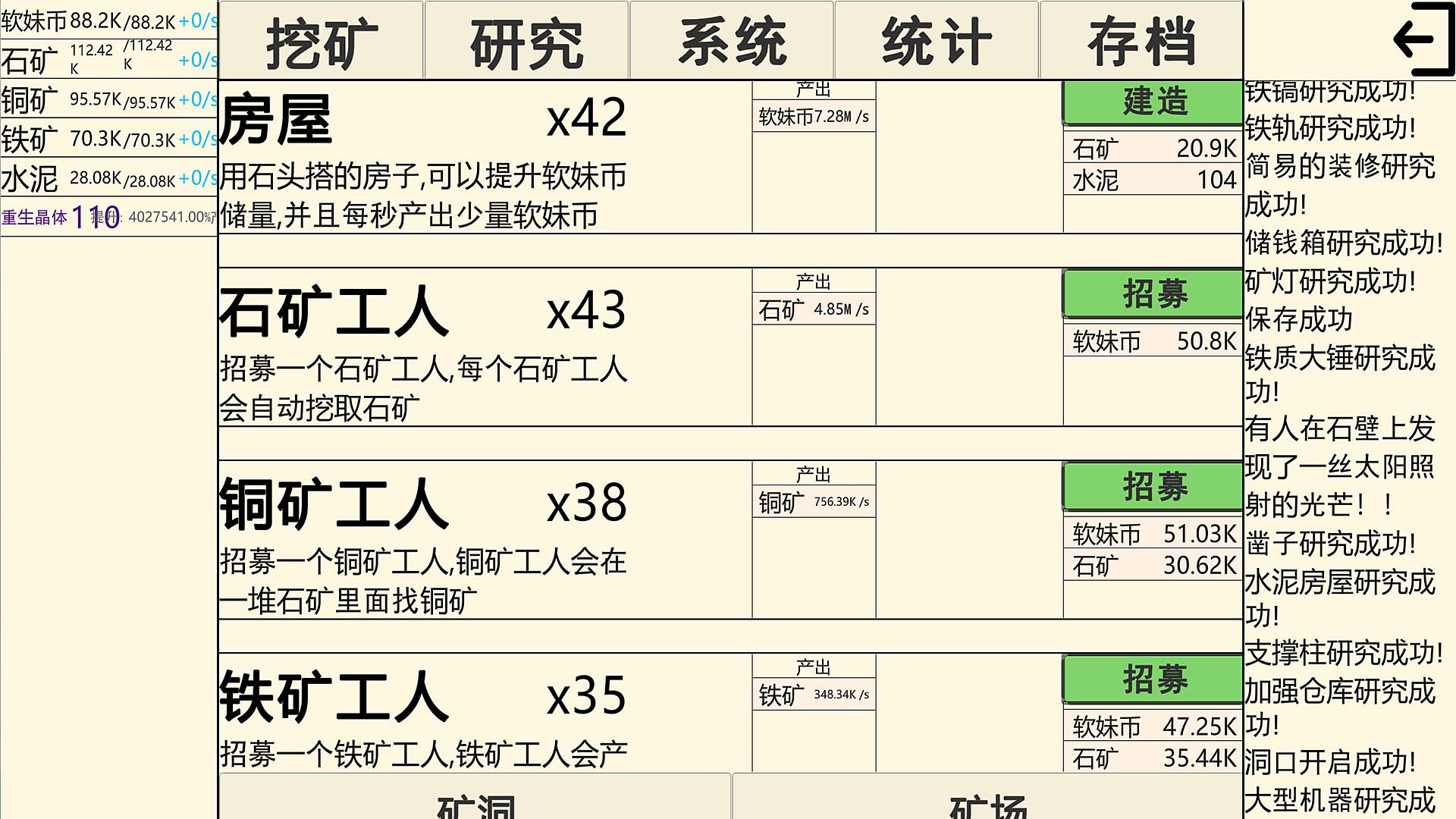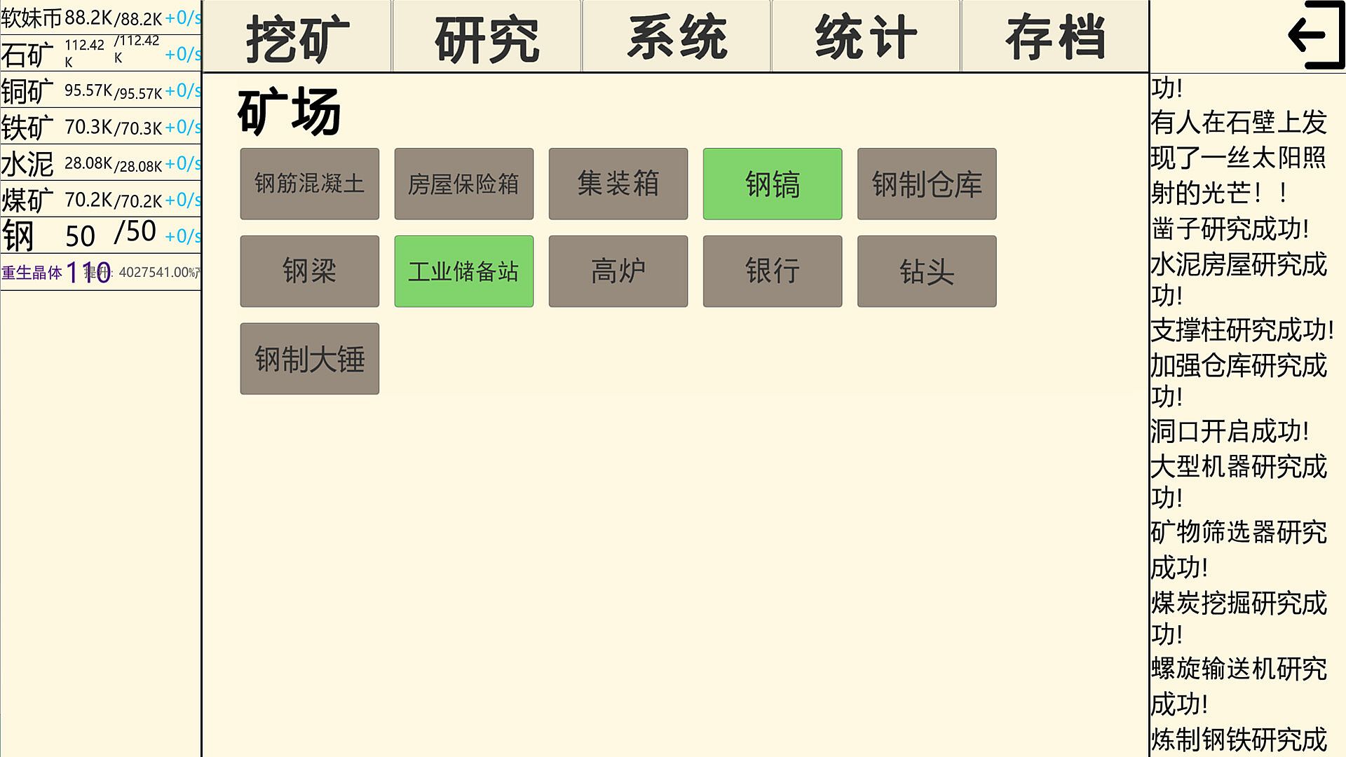 Click the mining button to start your resource collection journey. Every click will yield precious mineral resources, which are the foundation for your growth and development in the game world. Use the collected minerals to engage in technological research and unlock one powerful technology after another, from basic tools to complex automation technologies. The power of technology will safeguard your adventure.