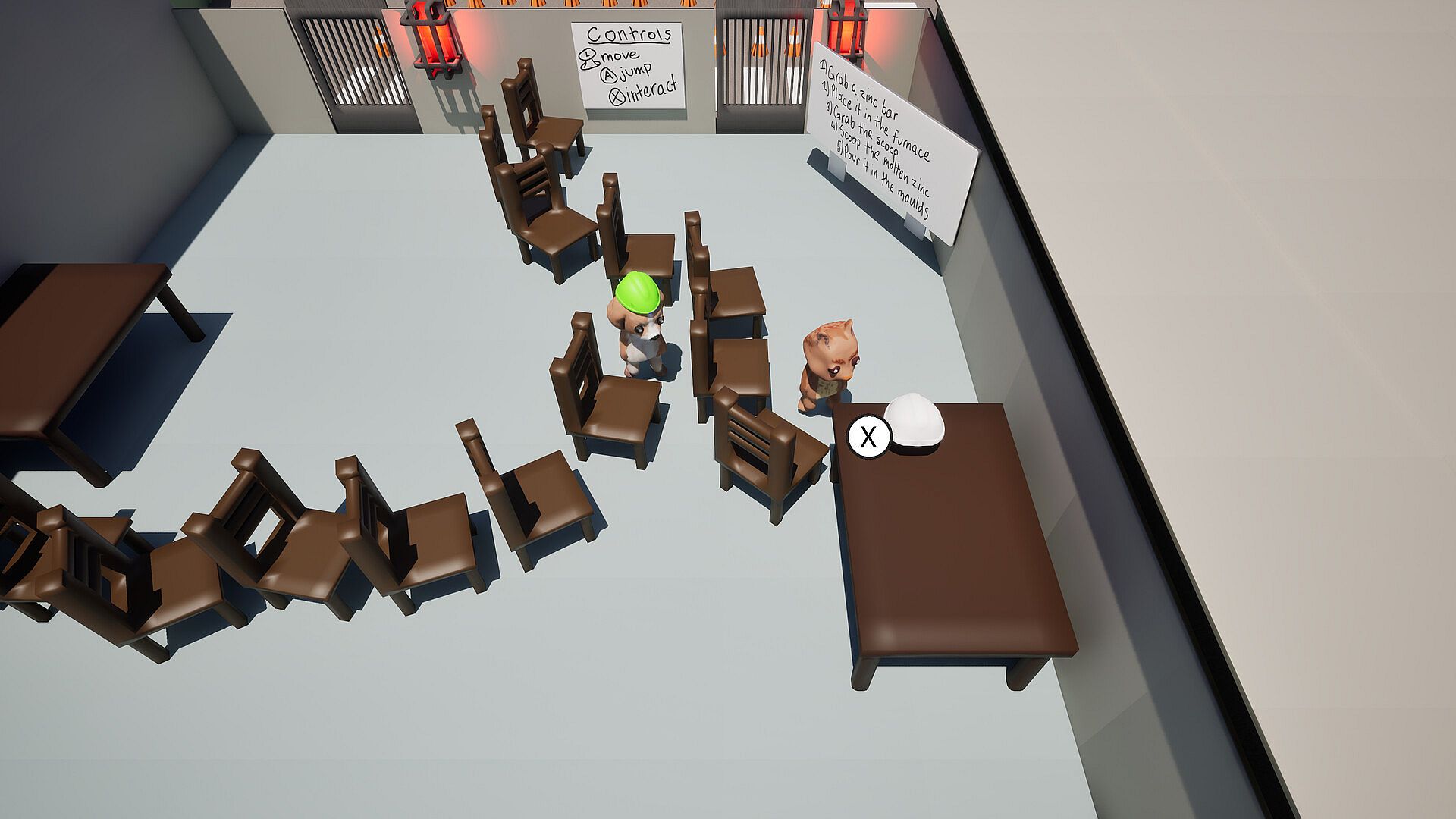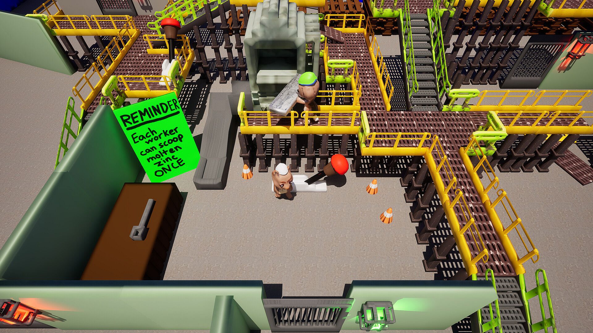 Carry zinc bars, pour molten metal, trigger levers, move along catwalks, and solve environmental challenges that simulate real industrial processes. Each room in the refinery introduces a new task, a new hazard, or a new mechanic to overcome together.