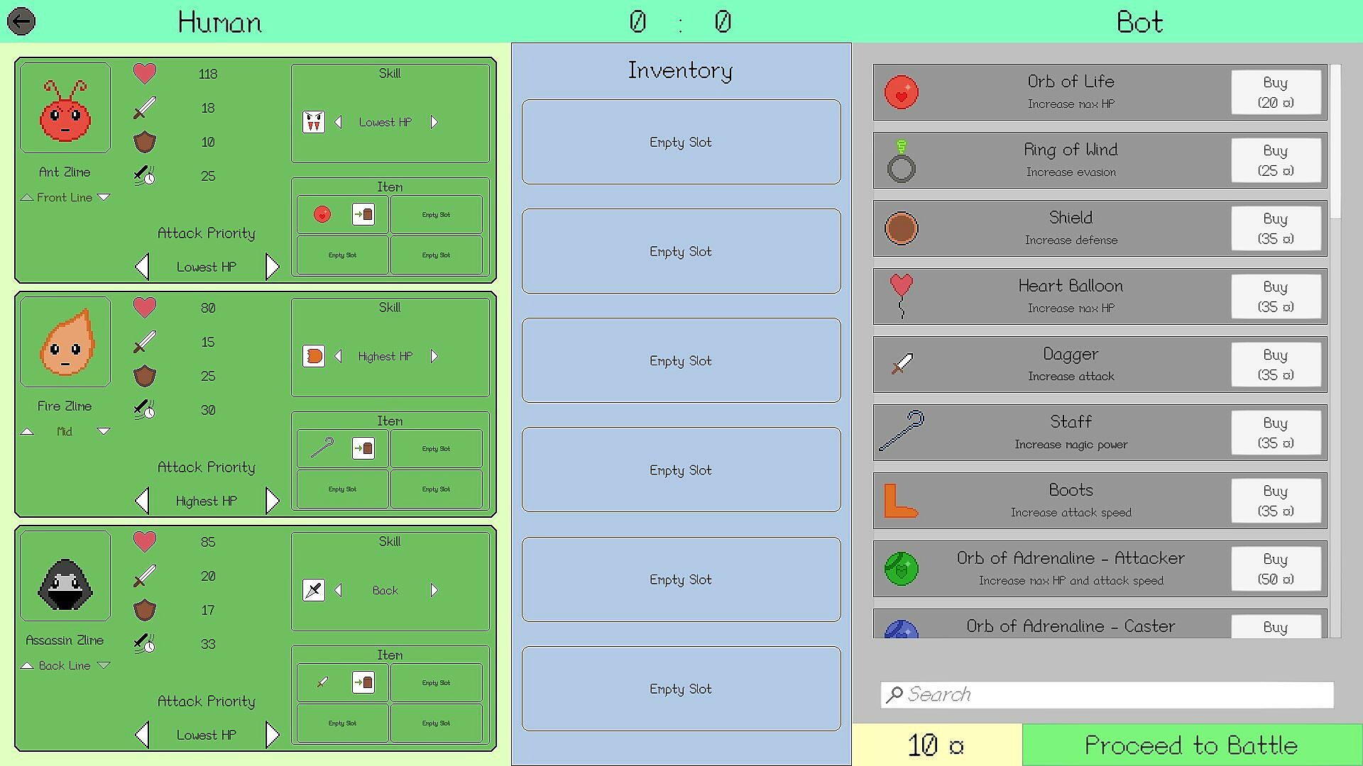 Each round, you will be provided with resources to buy the items for your Zlime. Some Zlimes are strong with certain items. Buy the necessary items for your Zlimes, or your team will be struggling in the battle.