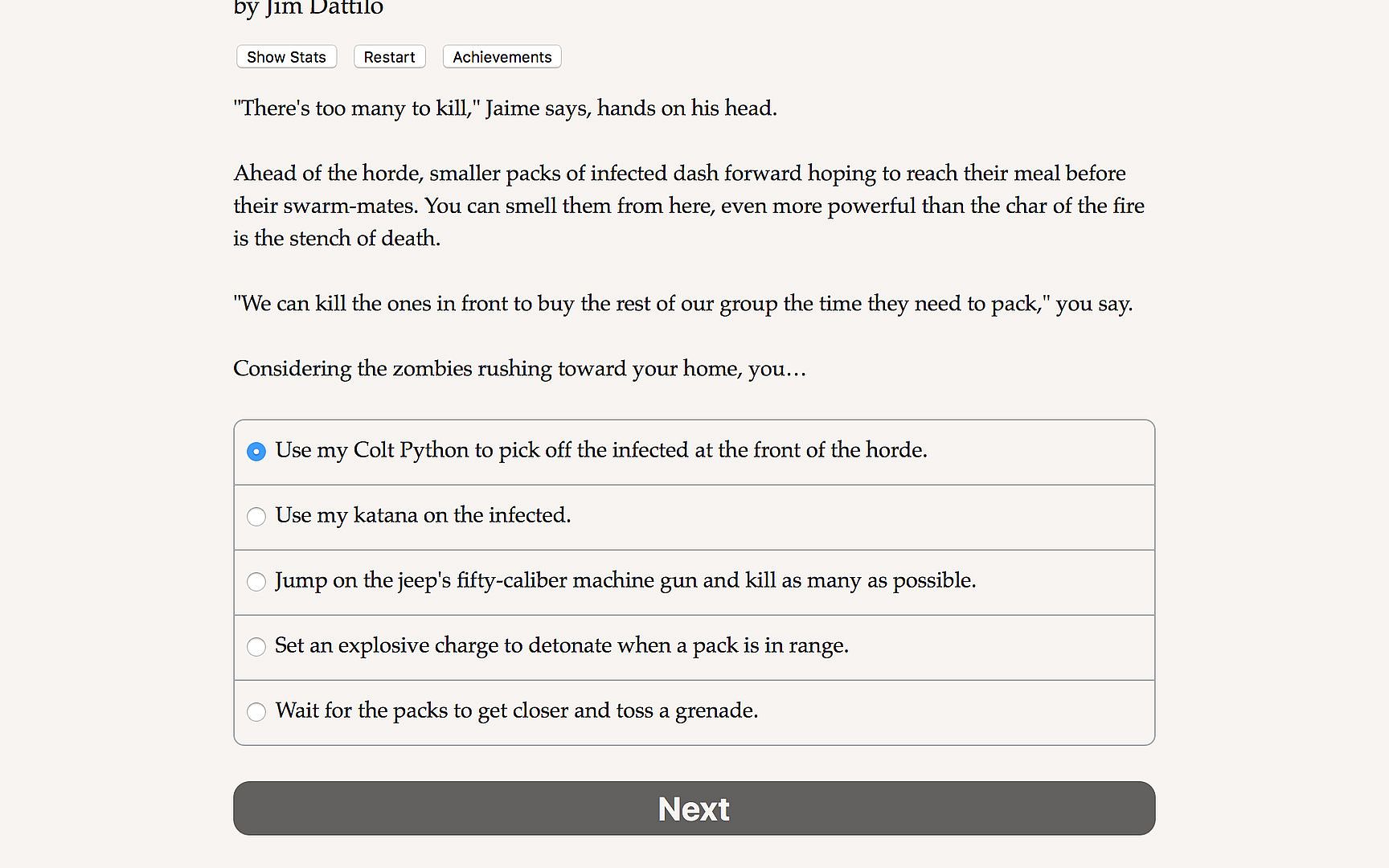 Zombie Exodus: Safe Haven is a series of thrilling interactive survival-horror novels by Jim Dattilo, where your choices control the story. It's entirely text-based—without animation or sound effects—and fueled by the vast, unstoppable power of your imagination.
