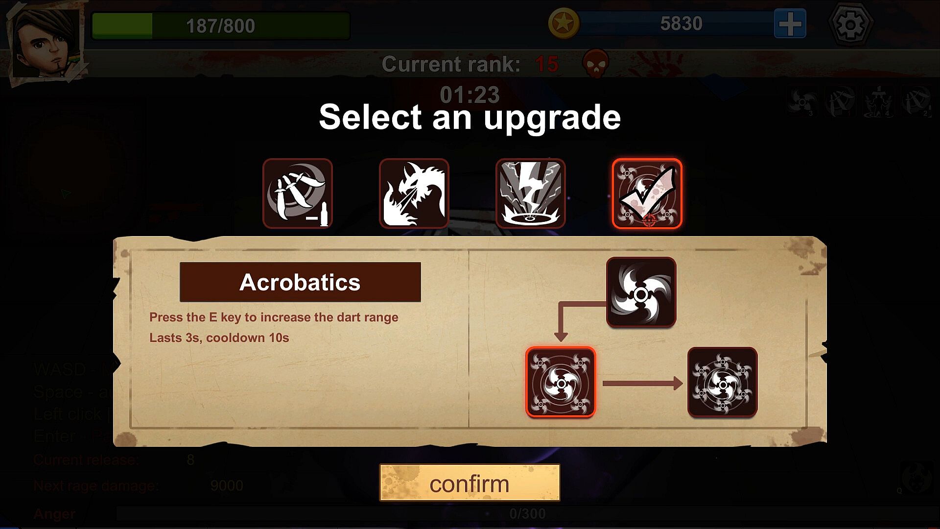 Active skill E : Death Acrobatics, expand the attack range of the darts around the character itself and keep it for a certain period of time. You need to collect all 3 darts to learn this skill. 3, 5 can unlock the speed stunt!
