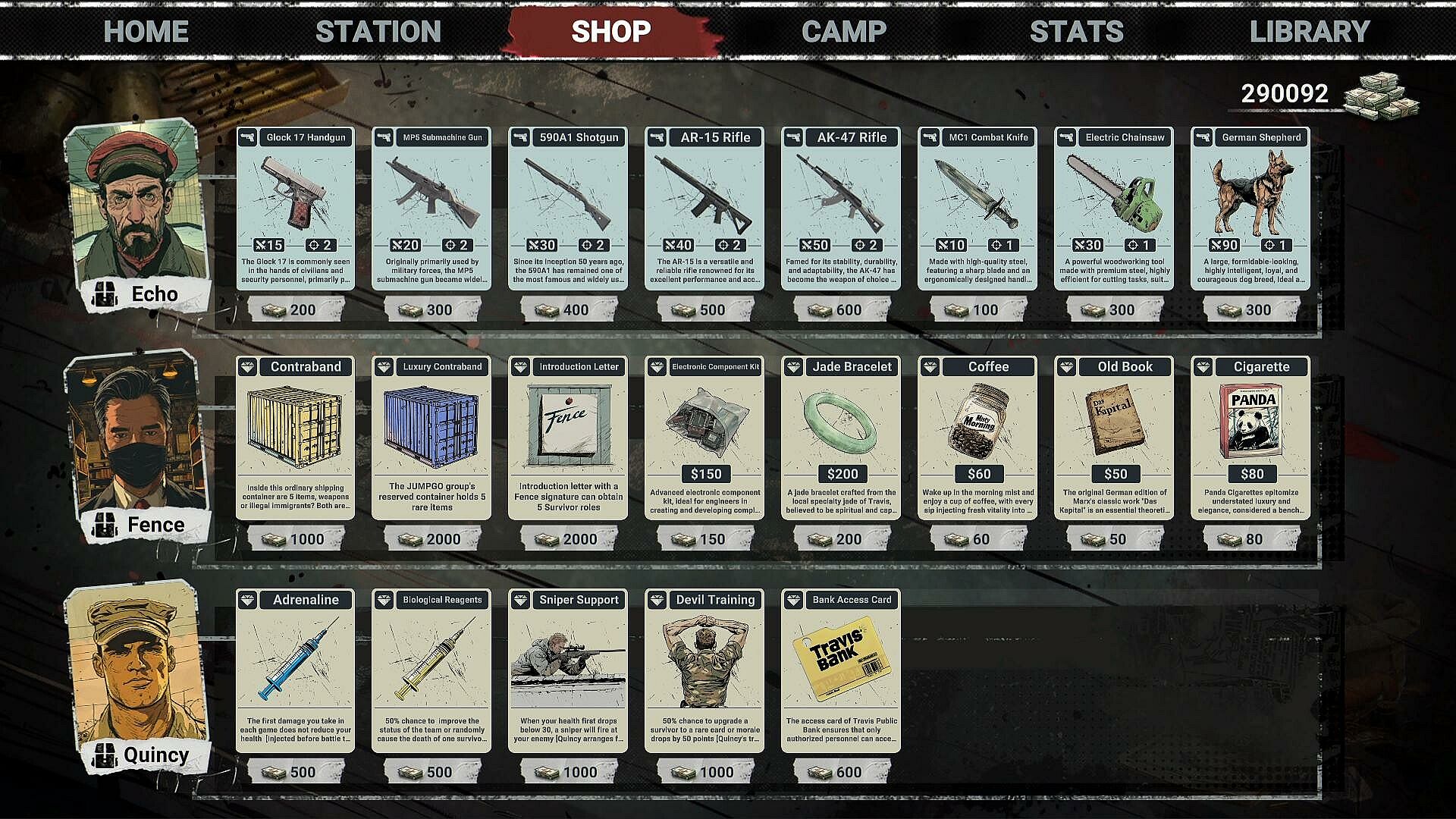 • Camp Building: Use scavenged materials and loots to build facilities in your camp, increasing your survival odds. (beware of shady black market merchants!)