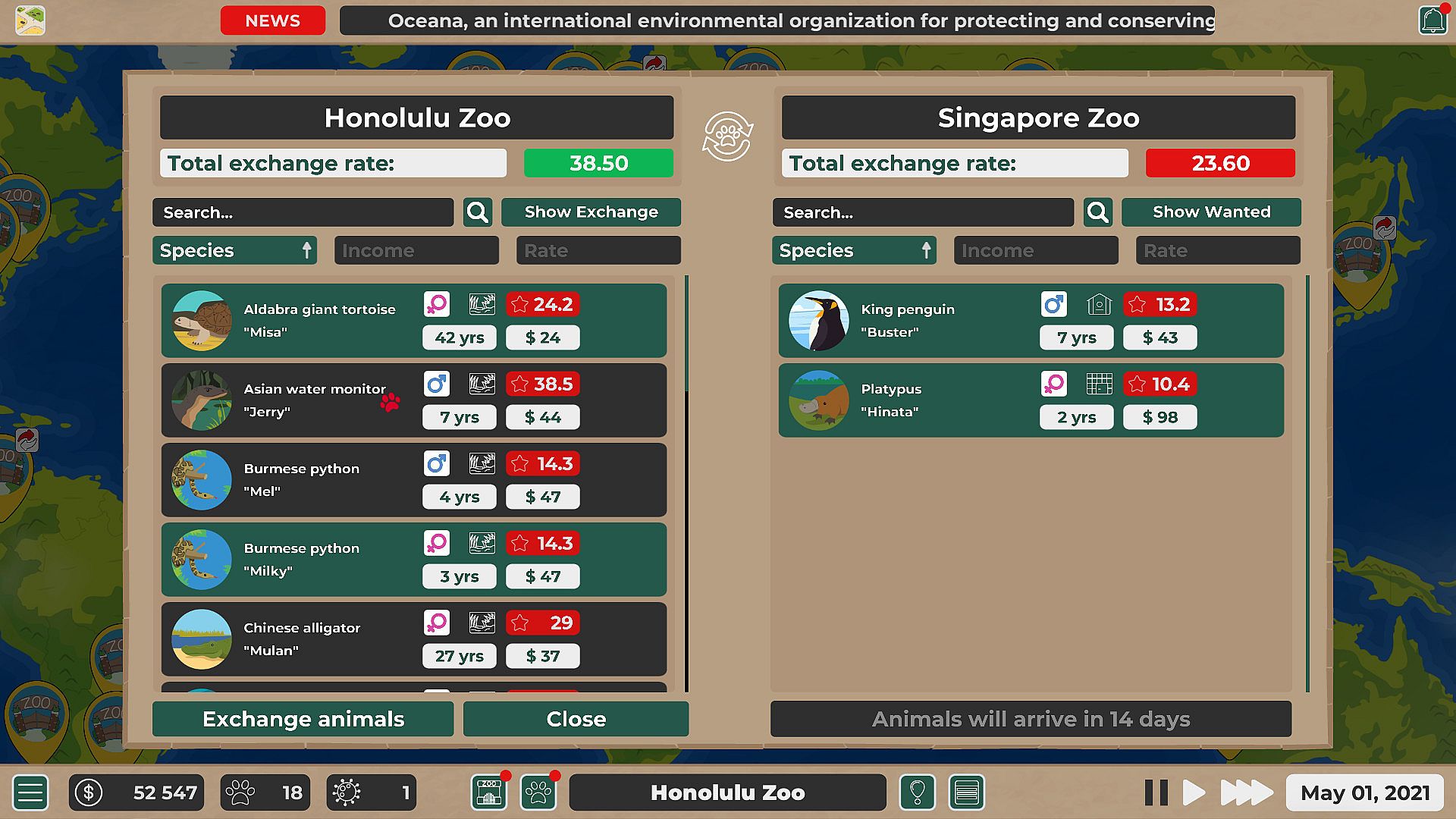 You're the zoo manager and head of the Zoo's exchange program. For various reasons you need animals and there are zoos which also want to exchange some of their animals. Find exchange chains, where you exchange with several other zoos only to exchange for animals you wanted in a first place. Animals are your currency. Build good relations with other zoos to exchange more animals or to exchange animals on your terms. Upgrade your zoo to increase capacity or to unlock new types of animals. Breed your unique animals to exchange them later and compete for the title of #1 zoo.