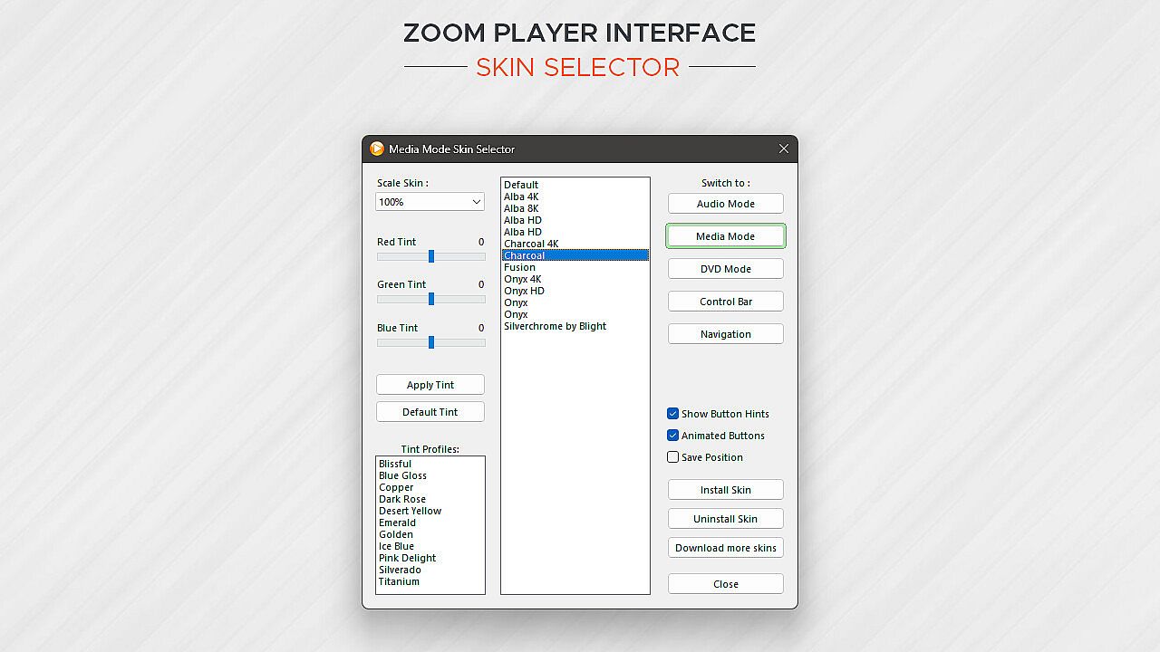 Zoom Player's user interface is designed to look good on any display, regardless of the screen size or resolution and is ideal for the visually impaired. You no longer need to be an artist or coder to craft a beautiful user interface tailored to your exact requirements, you can do it yourself with a few simple clicks.