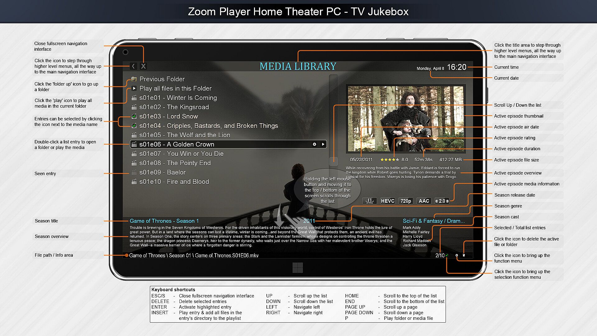 Home Theater? Zoom Player includes an extensive list of Home Theater features backed up by a powerful media library that can help organize your collection and content sources (see screenshots), including a TV and Movie JukeBox modes that displays Backdrop and Poster images along with meta-data such as description, actors, genre, content-rating, etc.