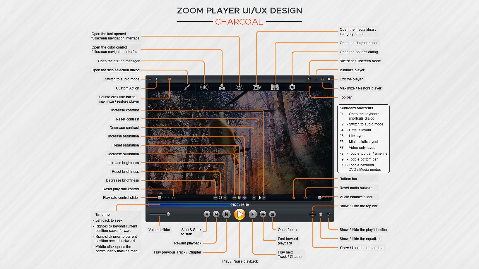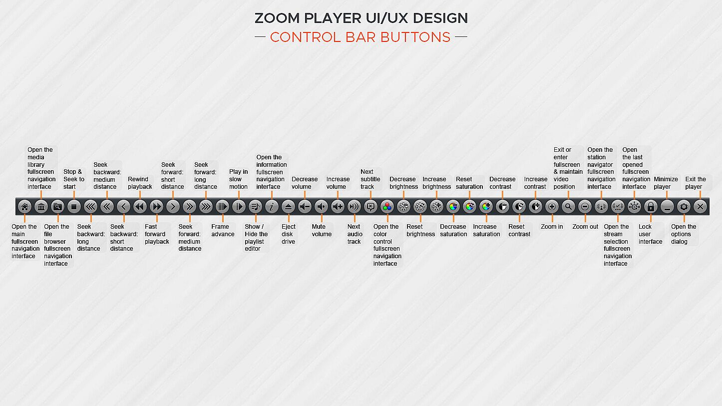 How does Zoom Player look? Amazing. The screenshots only tell half the story. With Zoom Player's powerful control overlay customization features, you can easily pick and choose which user interface elements appear on screen (buttons, volume bar, timeline bar, title text, etc), their size, color, transparency and much more.