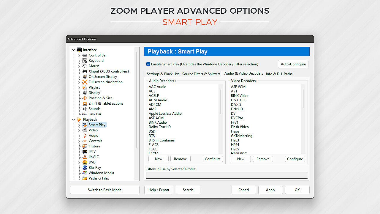 Under the hood, Zoom Player uses the best audio/video decoding and rendering technologies available to get the job done. Whether it's Microsoft DirectShow framework, the FFMPEG project, LAV Filters, libVLC or the Chromium browser, Zoom Player uses the best playback engine for the task. The flexibility of picking the right media engine for the task means that pretty much every media format can play at the highest quality your hardware can muster. And if it doesn't, I will do my best to resolve any issues in the discussions area.