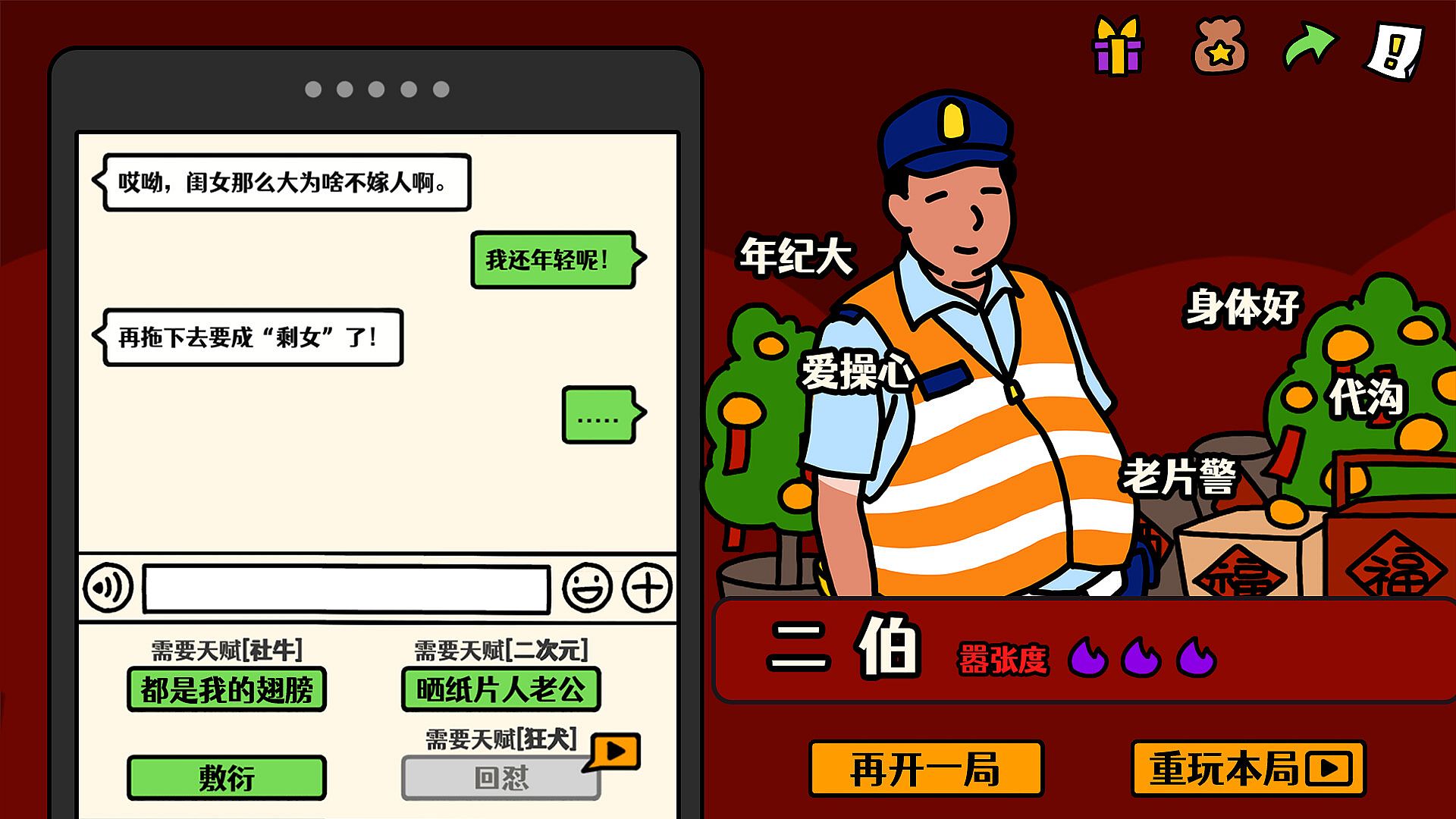 《走亲戚大作战》是一款AVG休闲类小游戏,游戏内容类型为模拟对话,简单的点击选项,完成过年过节时与亲眷的对话互动。让玩家感受到过节的气氛和亲们好友的团聚,在放松的同时,把亲戚们强加给你的死亡聊天大声勇敢的“怼”回去。