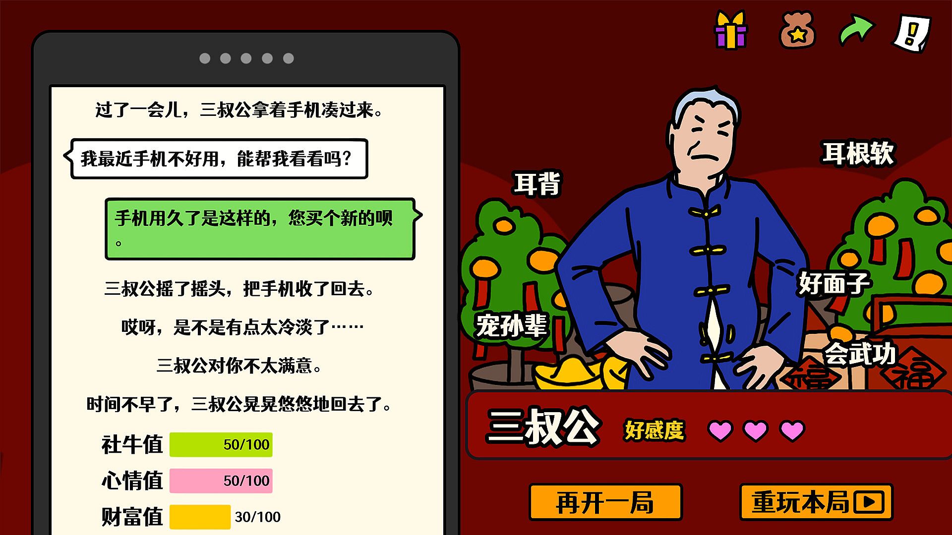 游戏整体以诙谐幽默的对话,展示亲朋好友互相串门时发生的趣事和对话。玩家通过简单的选项点击,即可完成游戏内容的推进并获得结局。