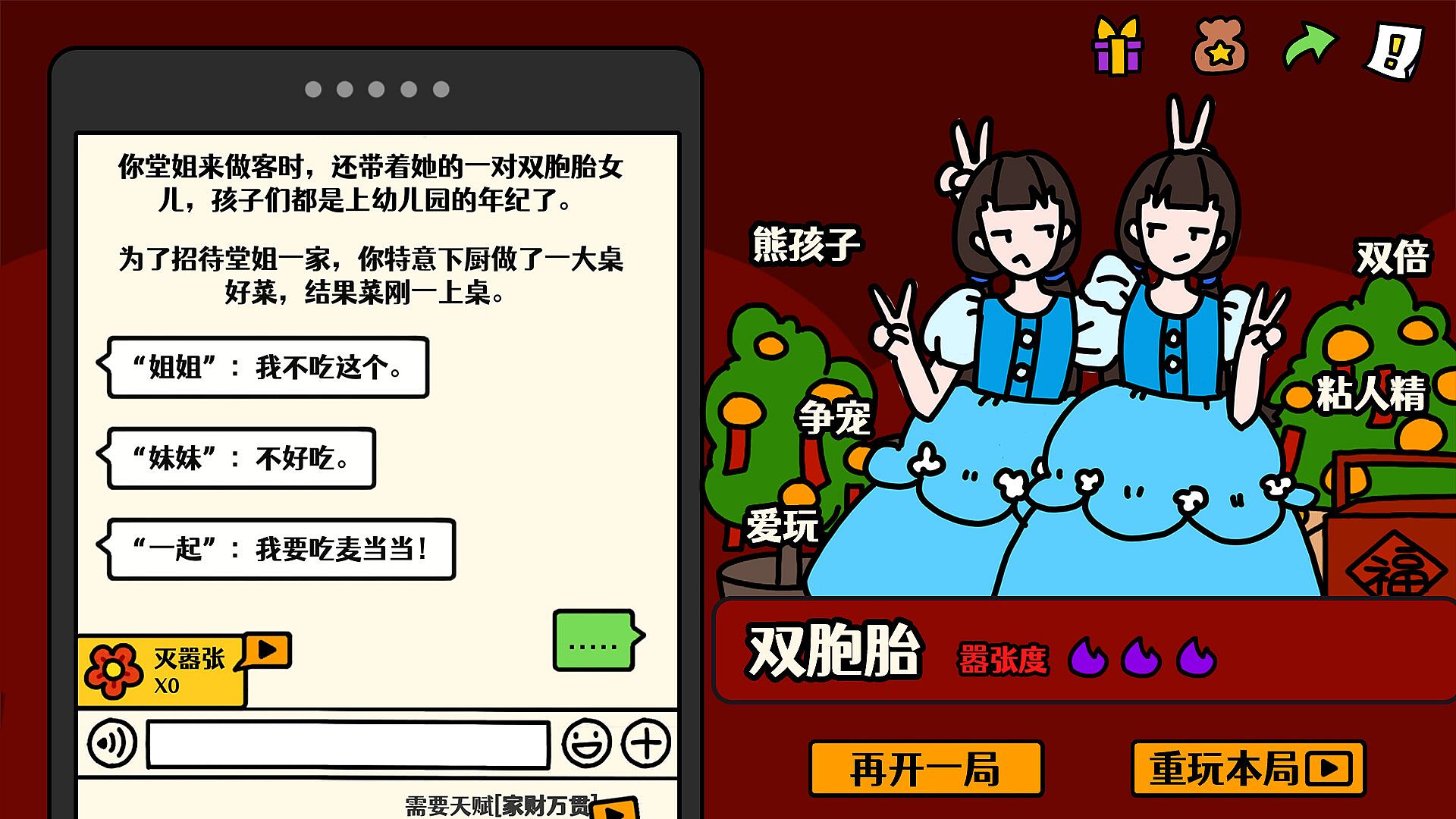 这是对于中国人而言,特殊到不能再特殊的几天:一个喜庆到不能再喜庆的节。你家七大姑八大姨叔叔伯伯爷爷奶奶随机来访!亲戚串门,有喜有忧。你要如何从亲戚们层层叠叠的连招里收获最完美的过节体验?