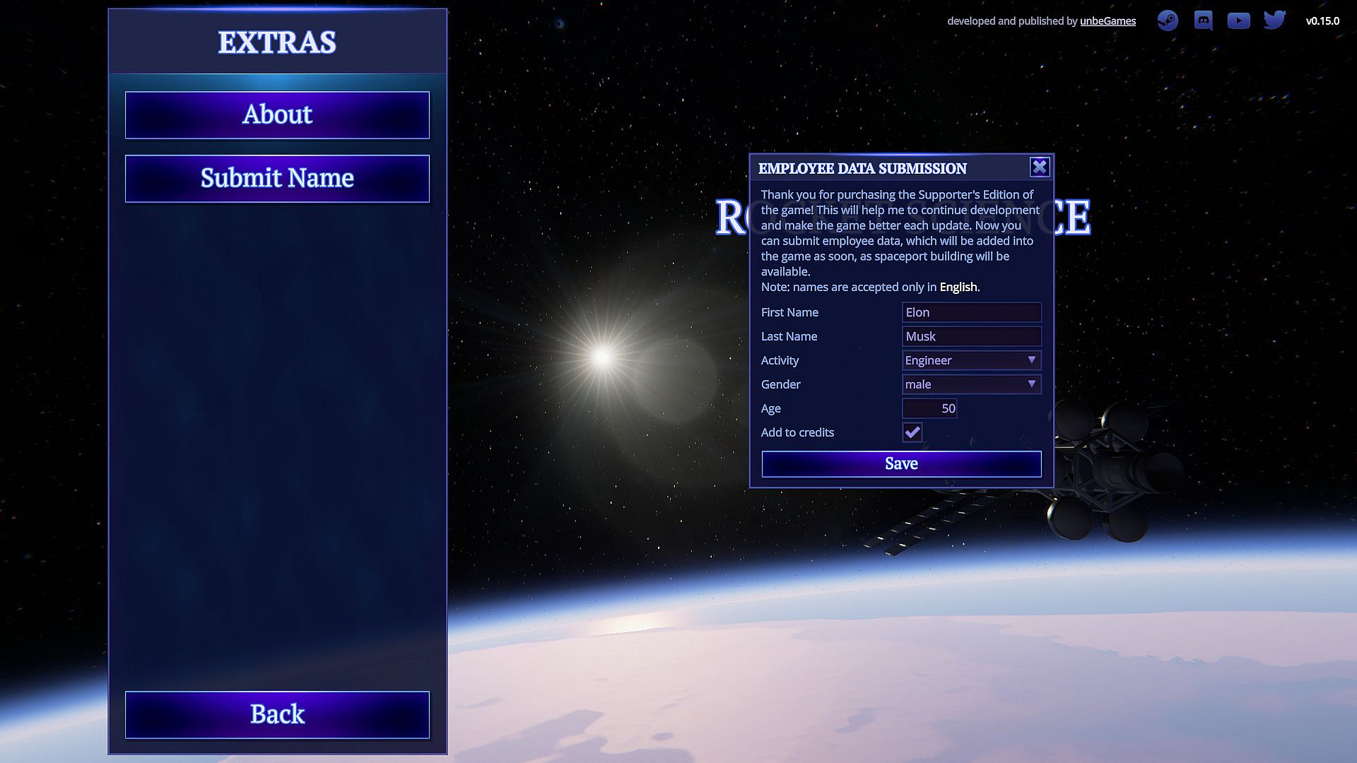 • Enter a name of employee into the game so it shows up in all players' games. Players will hire you and give you tasks, such as researching new technologies, building or maintaining their space center. All that with your help!