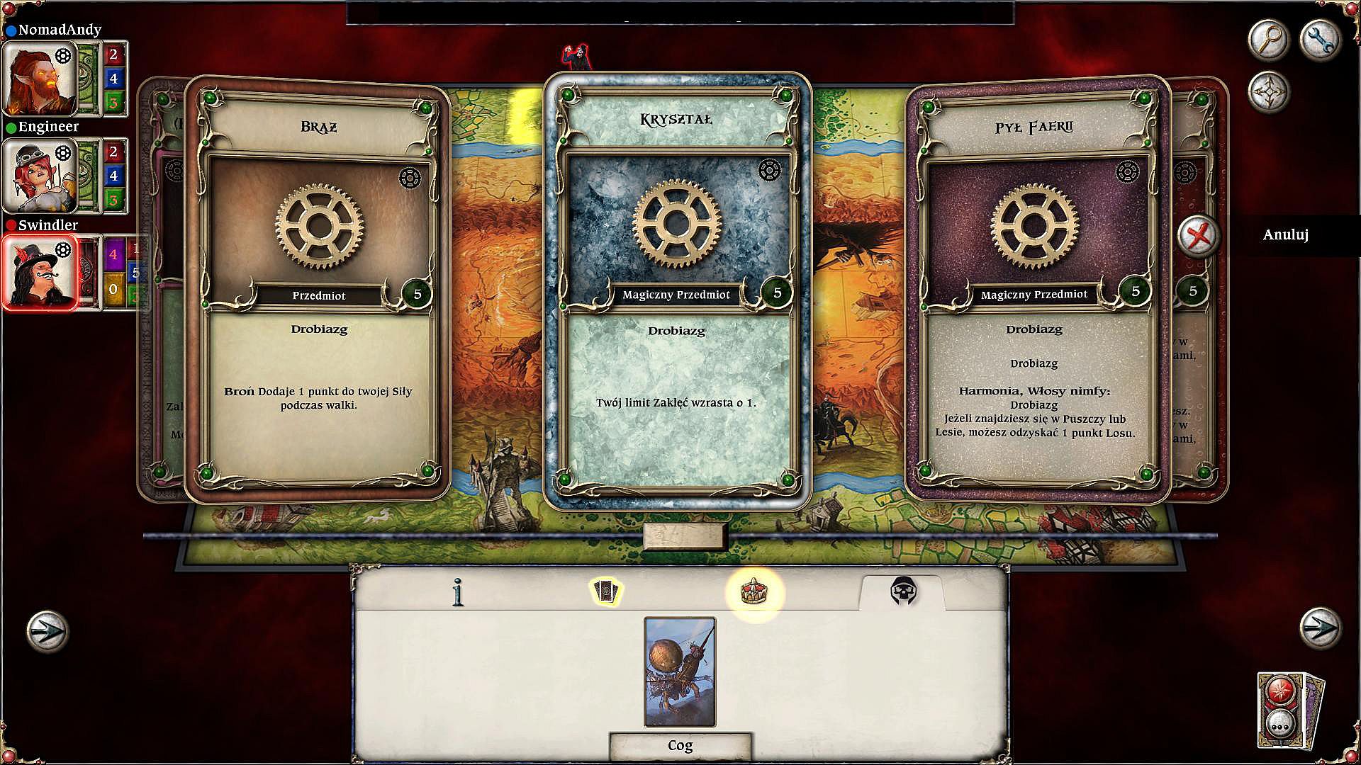 A mysterious moving shop now travels the outer region of Talisman. Known as Cog, this travelling store moves one space clockwise every round. If you’re lucky enough to encounter Cog, you’ll be rewarded by receiving 1 Material Card for free. You may then purchase additional material cards at the cost of 1 gold per material card already taken.