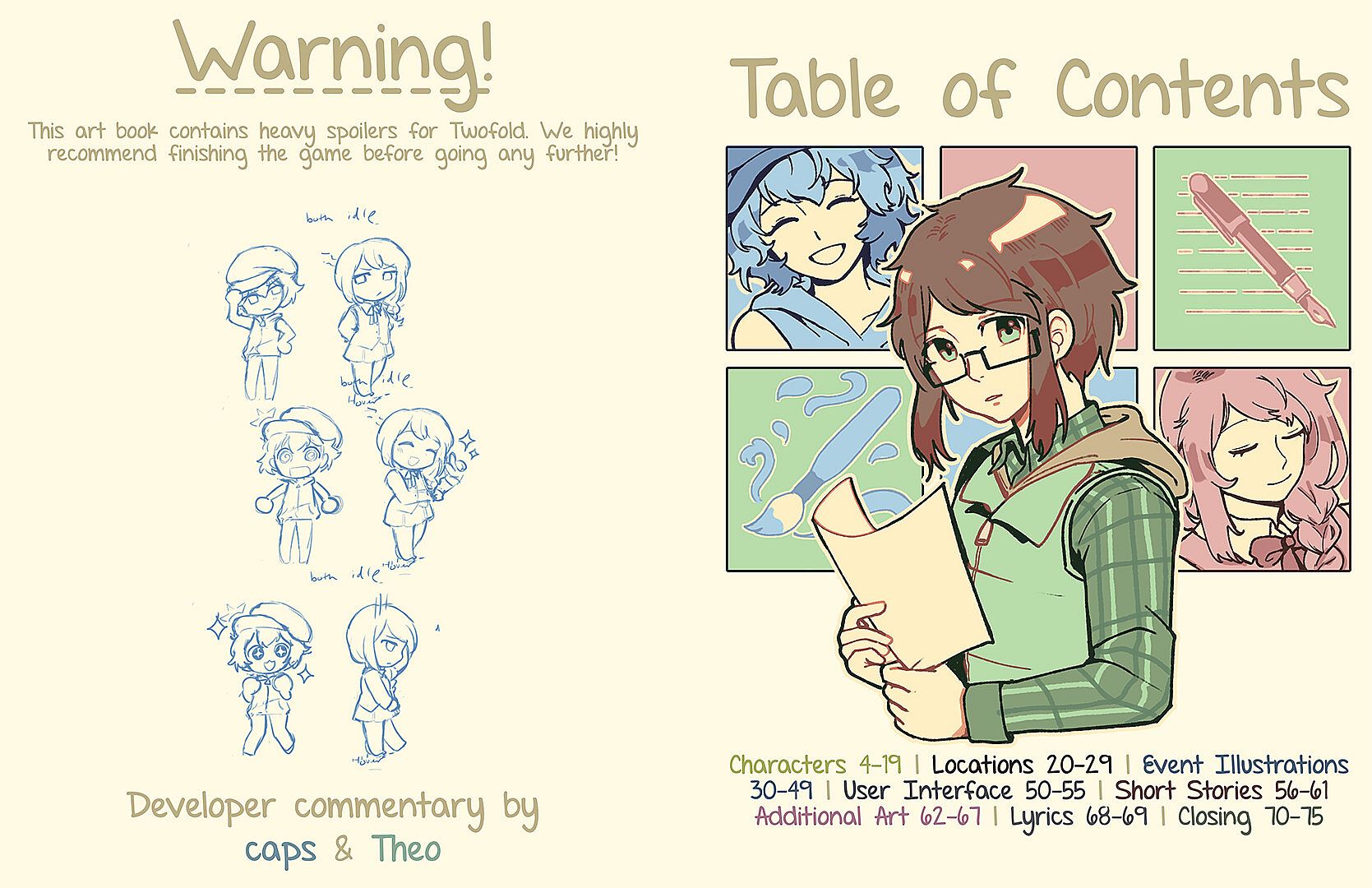 The official artbook for Twofold, featuring over 70 pages of illustrations, concept art, dev commentary and other goodies!