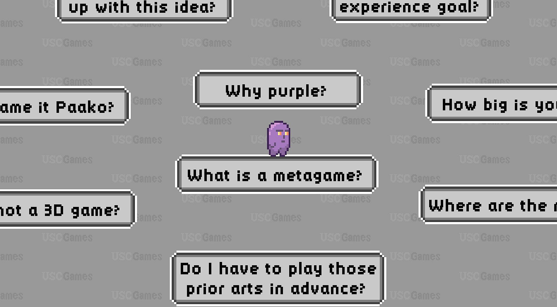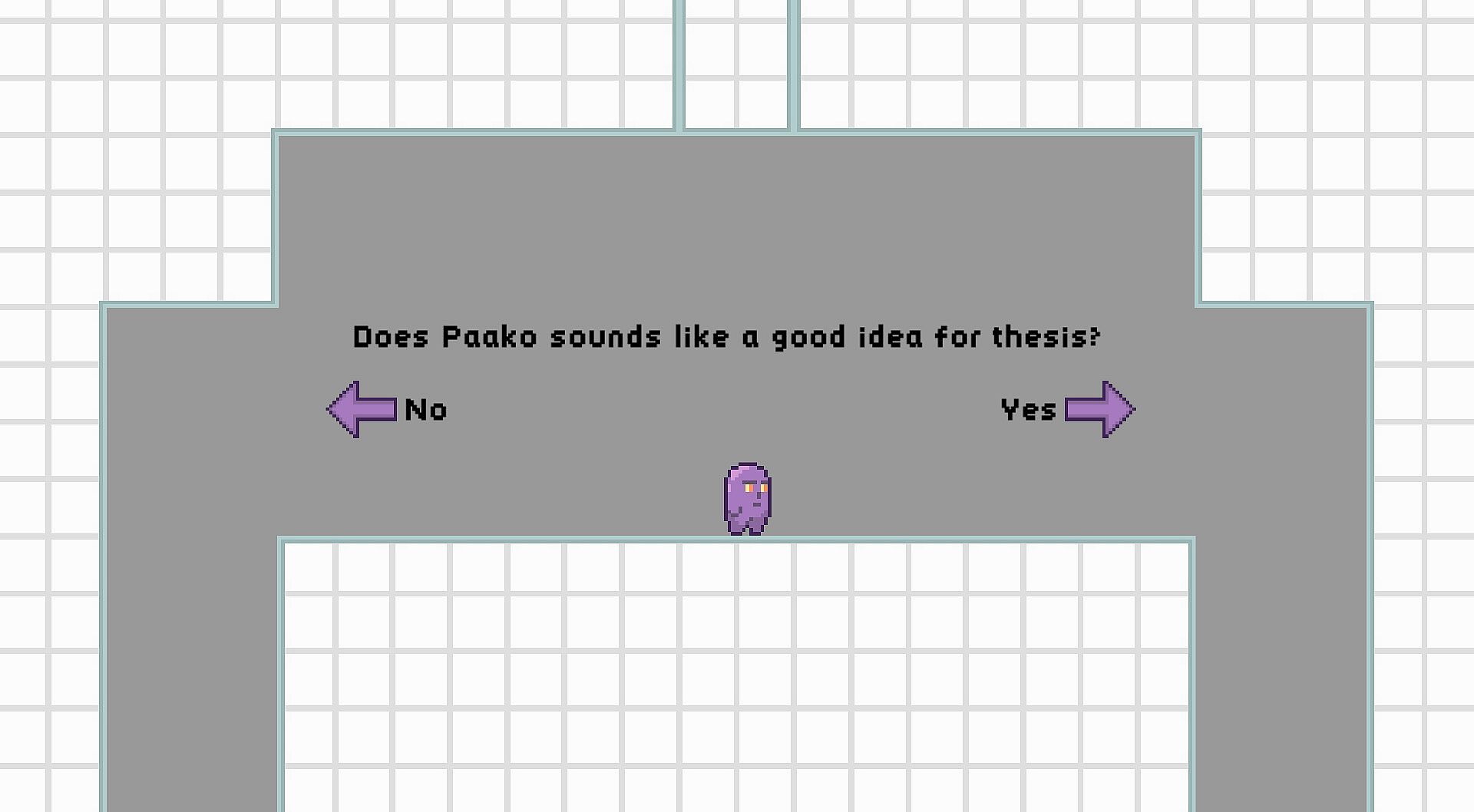 A Game Called Paako is a pixel-art 2D platformer metagame that tells the story of a game major graduate student making his thesis game project: A Game Called Paako.