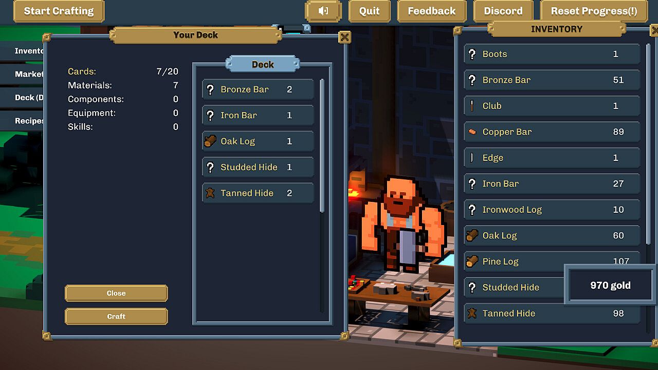 Anvil of Tristheim is a card-based crafting game where you merge material cards into components and then items. As the local blacksmith, heroes and those that would be soon line up at your shop. They'll tell you which dungeon they intend to crawl and it is up to you to equip them for it. Equip them too well and you will be operating at a loss - but equipping them not well enough will turn them and all the treasure they might have brought back to dragon food.