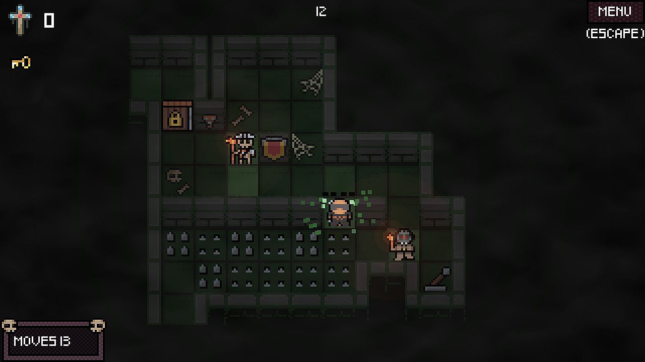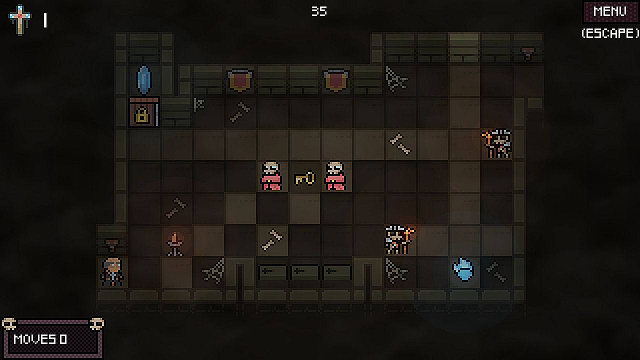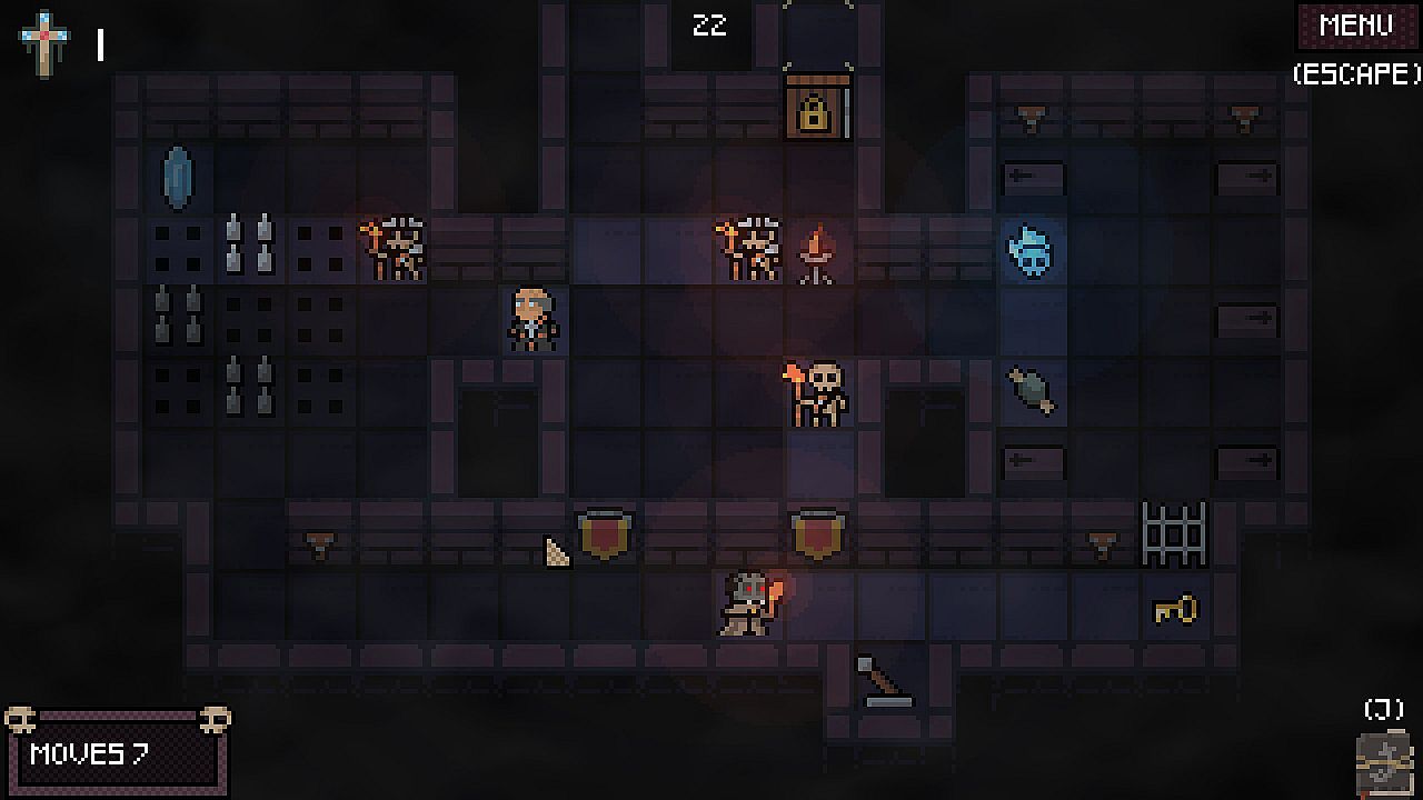 A turn-based puzzler with a teleporting mechanic about sneaking through an ancient crypt, while avoiding its traps and the undead.
