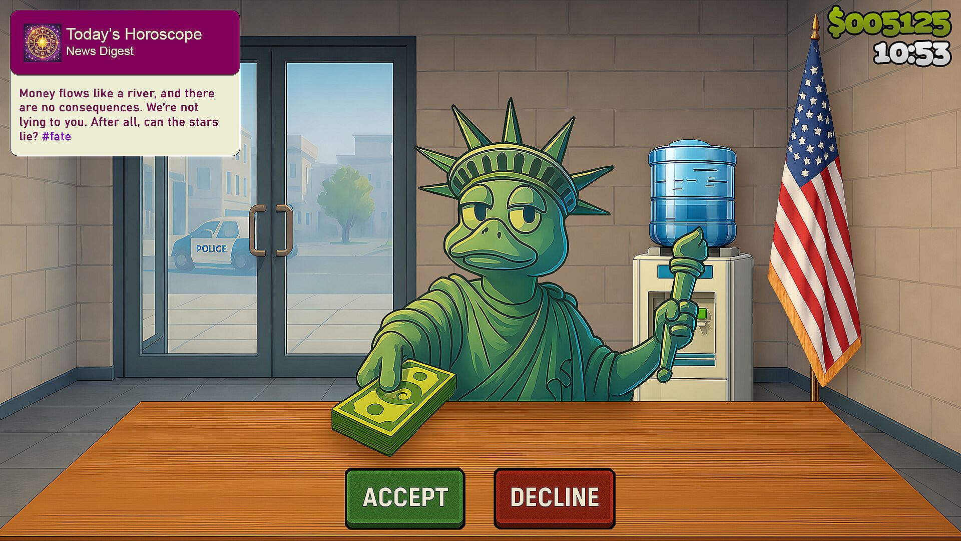 Accept bribes, refuse them, or find alternative solutions. With a simple interface, rich dialogue, and constant tension, every visitor becomes a test of your greed, fear, and common sense.