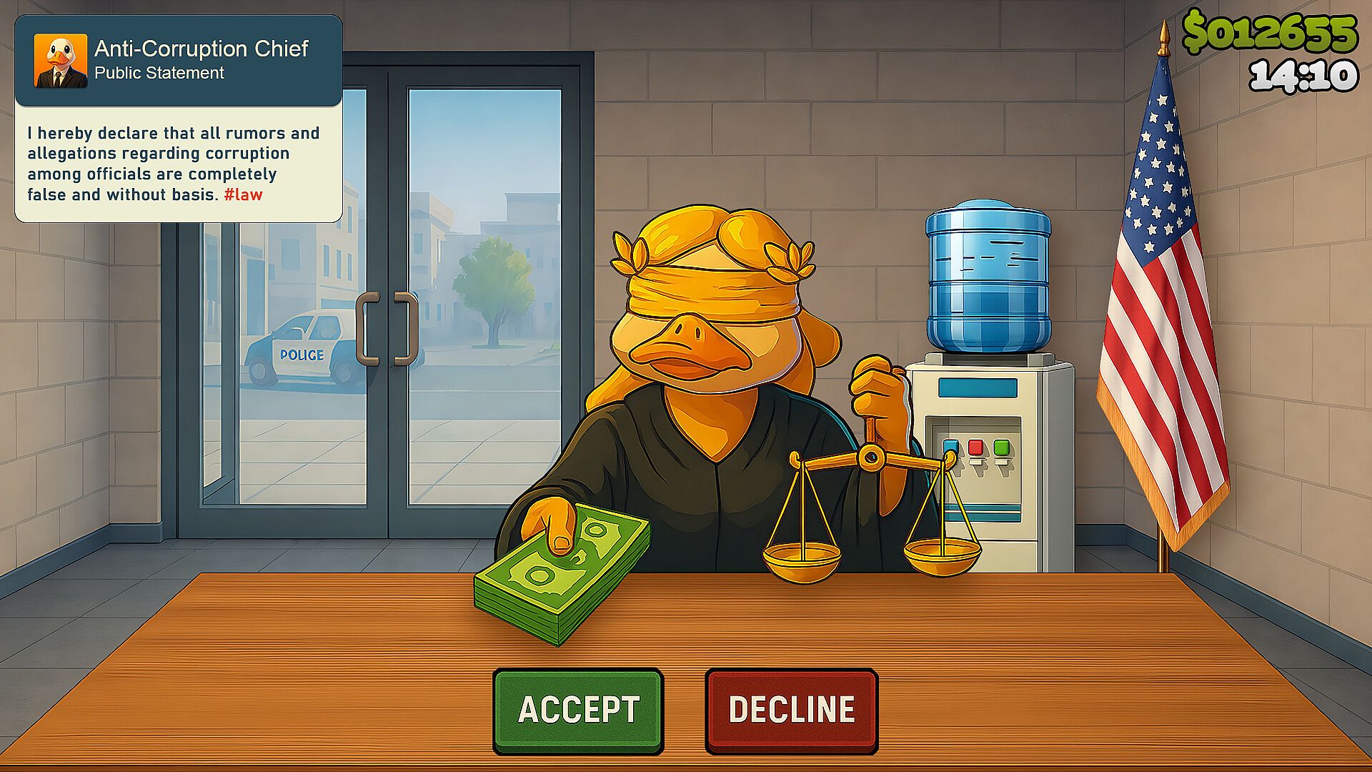 Welcome to Duck Angeles — a sun-soaked city inhabited by ducks, where corruption runs deep and every problem can be solved with the right envelope. Here, the law is just a formality, and order is maintained by those who know how to make deals. Heroes are long gone. But envelopes? There are plenty of those.