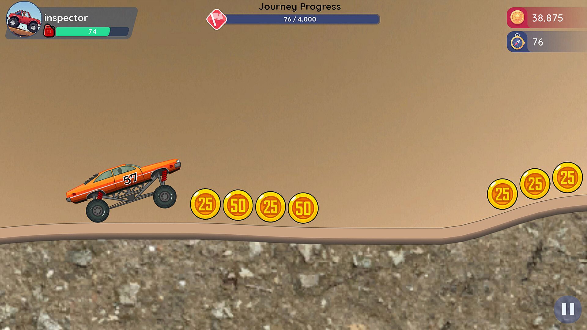 Coins are earned directly from driving. Collect coin pickups placed across the map and unlock one-time distance rewards the first time you push further on a given track. Hit key milestones (for example 500m) on a map for the first time and you’ll receive a bonus payout – then try to optimise your run by grabbing every coin you can along the way. Fail by flipping the car or running out of fuel and the run ends immediately.