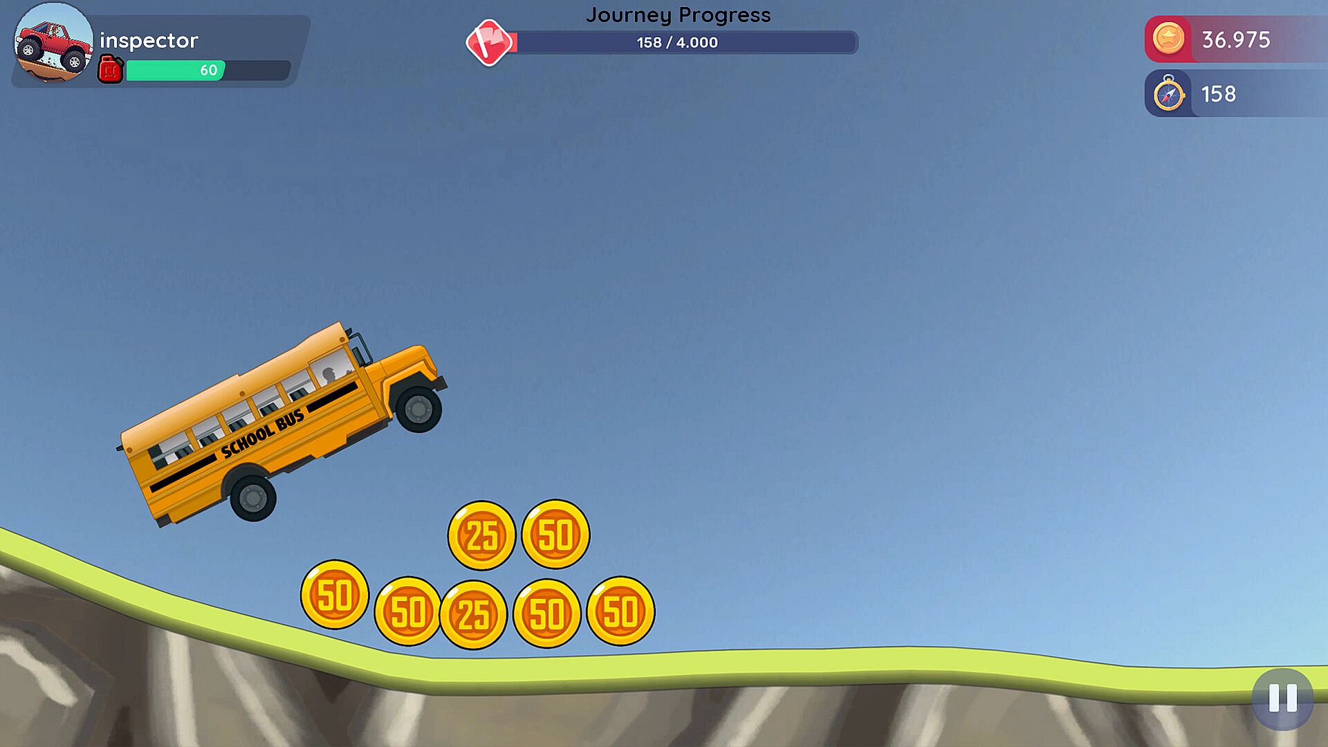 Vehicles are central to your progress. Start with a basic car, then use your coins to unlock 7 more – from jeeps and sports cars to a heavy school bus – each with different weight, grip and handling. Every car can be upgraded across four core systems: engine, wheels, fuel tank and speed. Investing in upgrades lets you climb steeper hills, carry more momentum over gaps and push further before refuelling becomes critical.