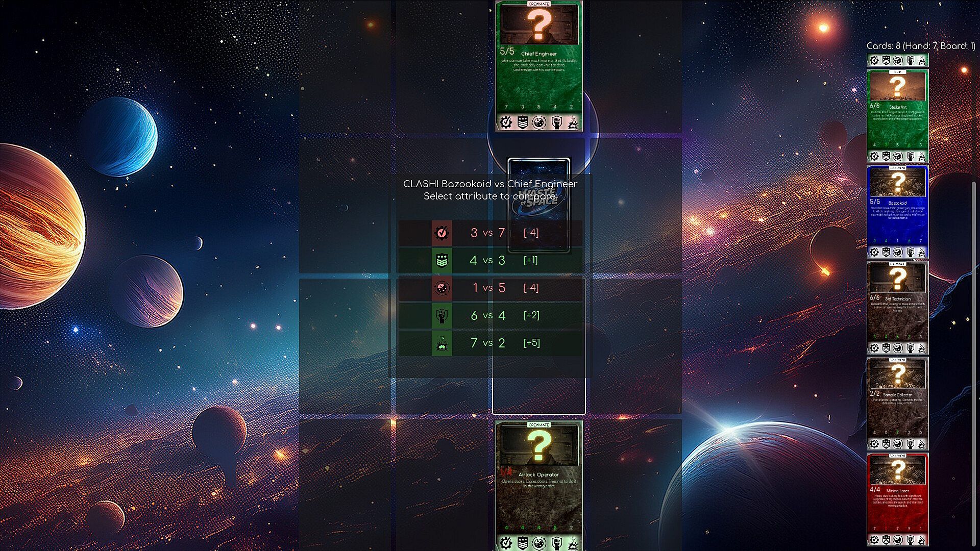 Waste of Space is a space-based card-collector and deck-builder set in a future where interplanetary governance has collapsed into bureaucracy, opportunism, and quiet rebellion. You assemble crews, ships, and equipment from a growing pool of catastrophically unqualified assets, deploy them on missions across the Solar System and beyond, and decide which broken vision of the future survives.
