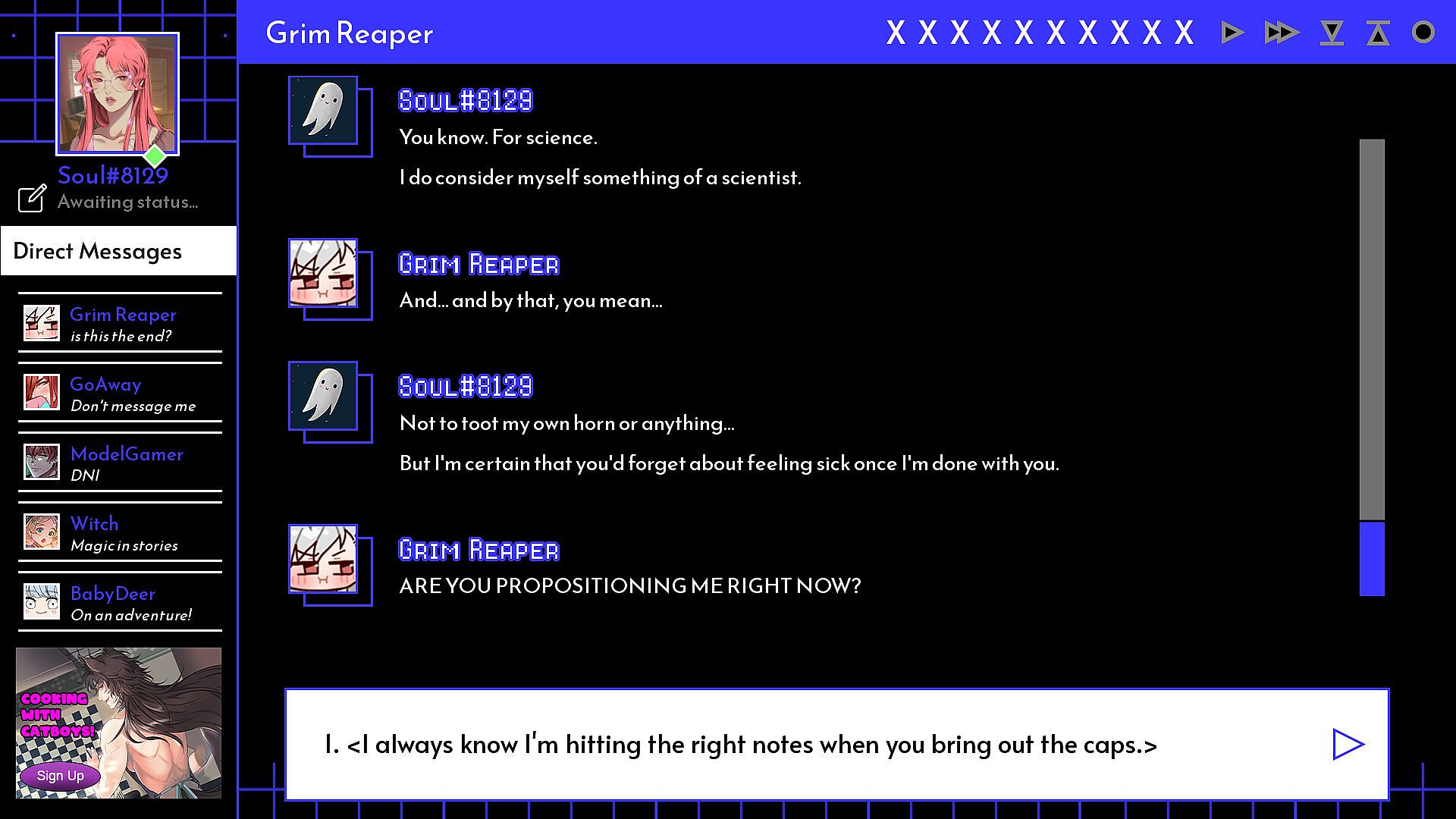 A Date with Death is a supernatural romance chat simulator visual novel about the week long bet you enter against the Grim Reaper to attempt to keep your soul. Create your own character, from appearance to pronouns, decorate your apartment, and spend the (possible) last week of your life getting to know the one hunting for your soul.