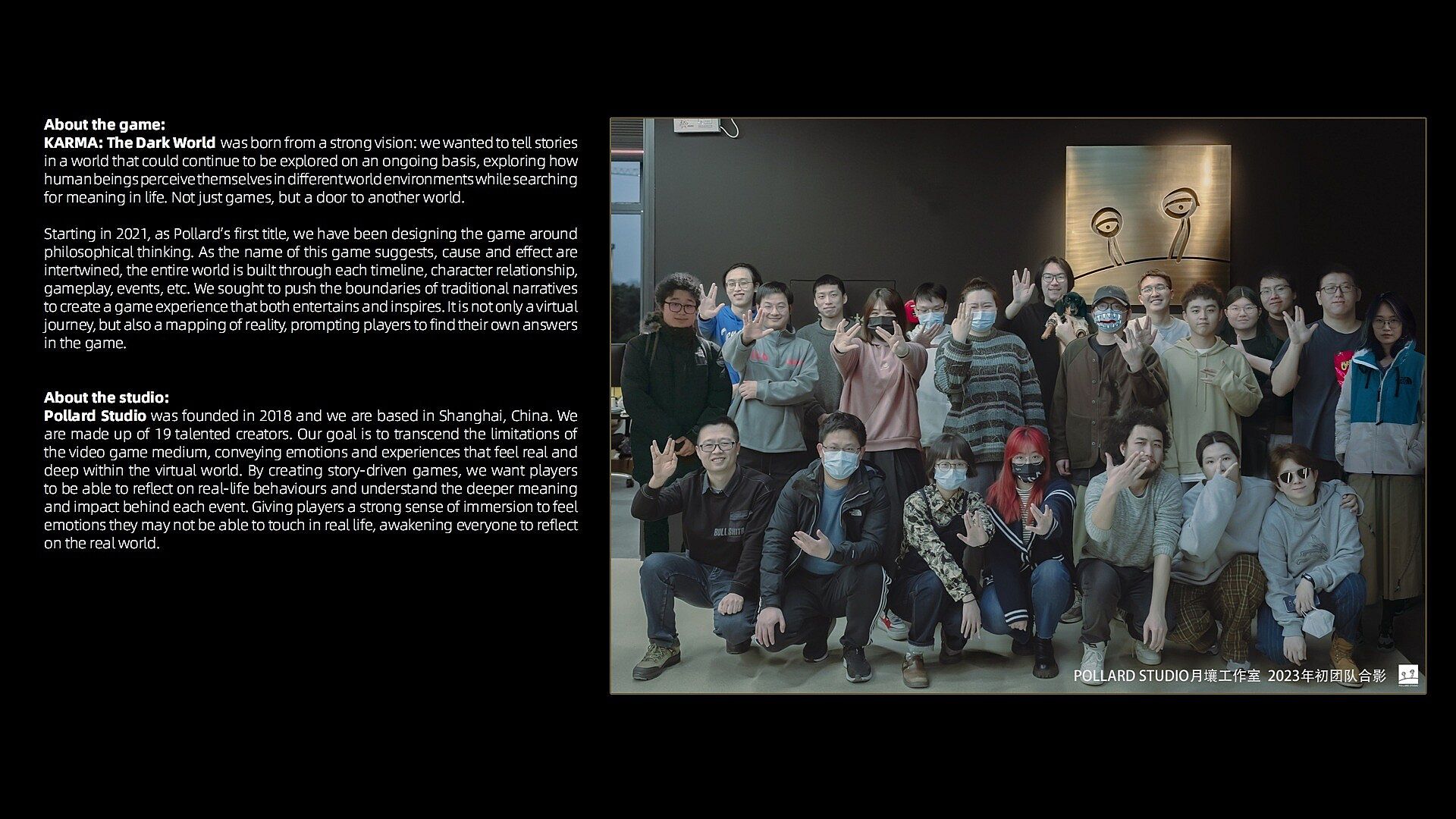 This artbook details the creation of KARMA: The Dark World, as well as sharing information about Pollard Studio and how the small indie team from China took art from concept sketches all the way through to a finished game.