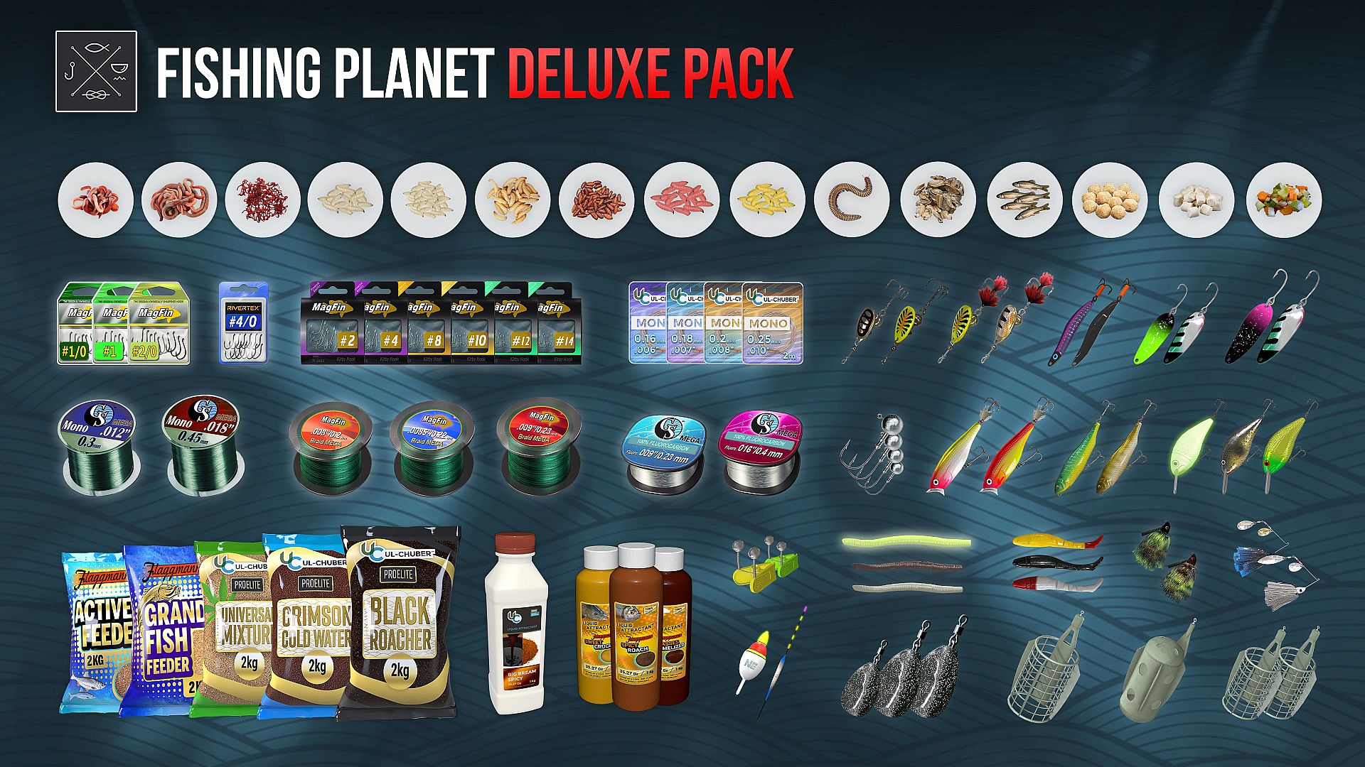 Skyrocket your angling progress and treat yourself to a truly deluxe fishing experience with the DELUXE STARTER PACK! We invested the time and effort to create the perfect set, that includes all the tackle and privileges of the Advanced Starter Pack, plus exclusive and more powerful Deluxe Edition goodies. The DELUXE STARTER PACK features SEVEN powerful Deluxe Edition rod and reel combos, along with superb Deluxe Edition fishing apparel - an all round basic set of superb equipment to cover all your progressive fishing needs! You also get Pond Passes to 10 FISHING DESTINATIONS, including the states of Missouri, New York, Colorado, North Carolina, Oregon, Florida, Canadian province of Alberta, as well as Czech, Netherlands and Italy! Yep, you get instant 14 DAYS of access to all these locations along with the corresponding Advanced Fishing Licenses! Deluxe Starter Pack includes: * 50 000 CREDITS * 50 BAITCOINS * 14-DAY PREMIUM * 5 Marker Buoys * 2 Storage Boxes (100 Slots) * 5 Tackle Setups * 5 Recipe Slots RODS ‘N REELS Rods: * Magfin™ NightFeather™ Deluxe Edition - Length: 6' 6"" (2 m); Lure Weight: 1/28–1/3 Oz. (1–9 g); Power: Ultralight; Line Weight: 3–10 Lb. (1.5–4.5 kg); Action: Fast; Pieces: 2; Guides: 9 * UL-CHUBER™ AllRound™ Deluxe Edition - Length: 12' 10"" (3.9 m); Casting Weight: 1 3/7 – 4 2/7 Oz. (40–120 g); Power: Heavy; Line Weight: 3–11 Lb. (1.5–4.5 kg); Action: Moderate; Pieces: 3+3; Guides: 10+6; Quiver Tips: 1 Oz., 2 Oz., 3 Oz. * Garry Scott™ DeluxeTroy™ - Length: 23' (7 m); Line Weight: 3–13 Lb. (1.5–6.0 kg); Action: Mod Fast; Pieces: 7; Guides: 10 * UL-CHUBER™ Deluxe Alli™ - Length: 13' 10" (4.2 m); Casting Weight: 3 1/28 – 6 1/4 Oz. (85–175 g); Power: X Heavy; Line Weight: 6.5–18.5 Lb. (3–8.5 kg); Action: Fast; Pieces: 3+3; Guides: 12+6; Quiver Tips: 3 Oz., 4 Oz., 5 Oz. * Magfin™ LuxCaster™ Deluxe Edition - Length: 7' 3"" (2.2 m); Lure Weight: 3/8-1 3/7 Oz. (10–40 g); Power: Heavy; Line Weight: 7.5–23 Lb. (3.5–10.5 kg); Action: Fast; Pieces: 2; Guides: 10 * RIVERTEX™ Loki™ Deluxe Edition - Length: 8' 10" (2.7 m); Lure Weight: 7/8 – 2 1/2 Oz. (25–70 g); Power: Heavy; Line Weight: 7–26.5 Lb. (4–12 kg); Action: Moderate; Pieces: 2; Guides: 10 * Garry Scott™ Brutus™ Deluxe Edition - Length: 10' 10" (3.3 m); Line Weight: 11–34 Lb. (5–15.5 kg); Action: Mod Fast; Pieces: 3; Guides: 14 Reels: * Magfin™ EspiraSlim™ Deluxe Edition - Ratio: 5.4:1; Recovery: 31.5"" (80 cm); Capacity: mono 3/100 (0.25/100), braid 6/125 (0.2/125); Max Drag: 8 Lb. (3.6 kg); Ball Bearings: 12+1; Weight: 7 Oz. (200 g); Drag: front * UL-CHUBER™ FeederForcer™ Deluxe Edition - Ratio: 4.8:1; Recovery: 32"" (81 cm); Capacity: mono 32/120 (0.5/120), braid 30/205 (0.28/205); Max Drag: 10.5 Lb. (4.75 kg); Ball Bearings: 4+1; Weight: 18.5 Oz. (524 g); Drag: front * Magfin™ EspiraML™ Deluxe Edition - Ratio: 4.7:1; Recovery: 27.5"" (70 cm); Capacity: mono 12/100 (0.3/100), braid 20/135 (0.23/135); Max Drag: 12.1 Lb. (5.5 kg); Ball Bearings: 7+1; Weight: 11.5 Oz.; Drag: front * Magfin™ BigRiver™ Deluxe Edition - Ratio: 6.0:1; Recovery: 47" (120 cm); Capacity: mono 32/120 (0.5/120), braid 30/205 (0.28/205); Max Drag: 18 Lb. (8.15 kg); Ball Bearings: 7+1; Weight: 19 Oz. (545 g); Drag: front * Magfin™ Counsellor™ Deluxe Edition - Ratio: 6.2:1; Recovery: 29.5"" (75 cm); Capacity: mono 12/120 ( 0.3/120), braid 20/160 (0.23/160); Max Drag: 23 Lb. (10.5 kg); Ball Bearings: 10+1; Weight: 9.2 Oz. (260 g); Brake: magnet & centrifugal * RIVERTEX™ HornetSwarm™ Deluxe Edition - Ratio: 5.0:1; Recovery: 35.5" (90 cm); Capacity: mono 32/120 (0.5/120), braid 30/205 (0.28/205); Max Drag: 24.2 Lb.(11.0 kg); Ball Bearings: 9+1; Weight: 14 Oz. (395 g); Drag: front * Magfin™ Espira DoublePunch™ Deluxe Edition - Ratio: 4.5:1; Recovery: 27.5" (70 cm); Capacity: mono 32/110 (0.5/110), braid 30/180 (0.28/180); Max Drag: 26.4 Lb. (12 kg); Ball Bearings: 9+1; Weight: 12.5 Oz. (355 g); Drag: rear TERMINAL TACKLE * Lines - Length 1000 yd (1000 m): Fluoro .009" (0.23 mm) - Test: 8 Lb. (3.6 kg) Braid .008" (0.2 mm) - Test: 10 Lb. (4.5 kg) Mono .012" (0.3 mm) - Test: 12 Lb. (5.4 kg) Braid .0085" (0.22 mm) - Test: 7.7 kg (17 Lb.) Braid .009" (0.23 mm) - Test: 20 Lb. (9.1 kg) Fluoro .016" (0.4 mm) - Test: 20 Lb. (9.1 kg) Mono .018" (0.45 mm) - Test: 25 Lb. (11.3 kg) * Mono Leaders - Length: 2 yd (2 m): .006" (0.16)- Test: 7 lb (3.15 kg) .007" (0.18)- Test: 8.3 lb (3.8 kg) .008" (0.2) - Test: 9.7 lb (4.4 kg) .010" (0.25) - Test: 14.3 lb (6.5 kg) * Bobbers: Glowing Slim Float; Glowing Pear-Shaped Float * Hooks: #14; #12; #10; #8; #4; #2; #1; #1/0; #2/0; #4/0 * Sinkers: 1 3/4 Oz. (50 g ); 3 1/2 Oz. (100 g); Sinker 4 1/4 Oz. (125 g) * Open Feeders: 2 Oz. (60 g); 4 1/16 Oz. (115 g) * Closed Feeders: 3 1/2 Oz. (100 g) * Simple Bells: 2 * Jig Heads: 1/6 Oz. (5 g), #1/0; 1/4 Oz. (7 g), #1; 1/2 Oz. (14 g), #2/0; 3/4 Oz. (21 g), #3/0 * Worms: Worm 12.5 cm (5"") (x2); Worm 6"" (15 cm) * Shads: Shad 2" (5 cm) (x3), Shad 3" (7 cm) (x2) * Spinnerbaits: Spinnerbait 3/4 Oz. (21 g) #3/0 (x2) * Bass Jigs: Bass Jig 1 Oz. (28 g), #4/0 (x2) * Spinners: Nano Spinner 1/8 Oz. (4 g), #1 (x2); Barbless Nano Spinner 1/5 Oz. (6 g), #1/0 (x2) * Spoons: Narrow Spoon 1/4 Oz. (7 g), #1/0 (x2); Single Spoon 1 Oz. (28 g), #2/0 (x2); Single Spoon 1 1/2 Oz. (42 g), #4/0 (x2) * TopWater Lures: Popper 1/4 Oz. (7 g), #1/0 (x2); Walker 1/2 Oz. (14 g), #3/0 (x2) * Crankbaits: Crankbait 3 ft. (1 m), #2/0; Crankbait 12 ft (3.5 m) #2/0; Crankbait 23 ft (7 m) #3/0 * Baits: Red Worms; Maggots; Semolina Balls; Caster Maggots; Bloodworms; Wax Worms; Marshmallows; Yellow Maggots; Small Minnows; Vegetables; Red Maggots; Duck Mussel Meat; Centipedes; Pinkies; Night Crawlers * Groundbaits: Crimson Cold Water Golden; Active Feeder Golden; Black Roacher Golden; Universal Mixture Golden; Grand Fish Feeder Golden * Aromas: Molasses Caramelized Golden; Sweet Crucian Golden; Spicy Roach Golden; BigBrea