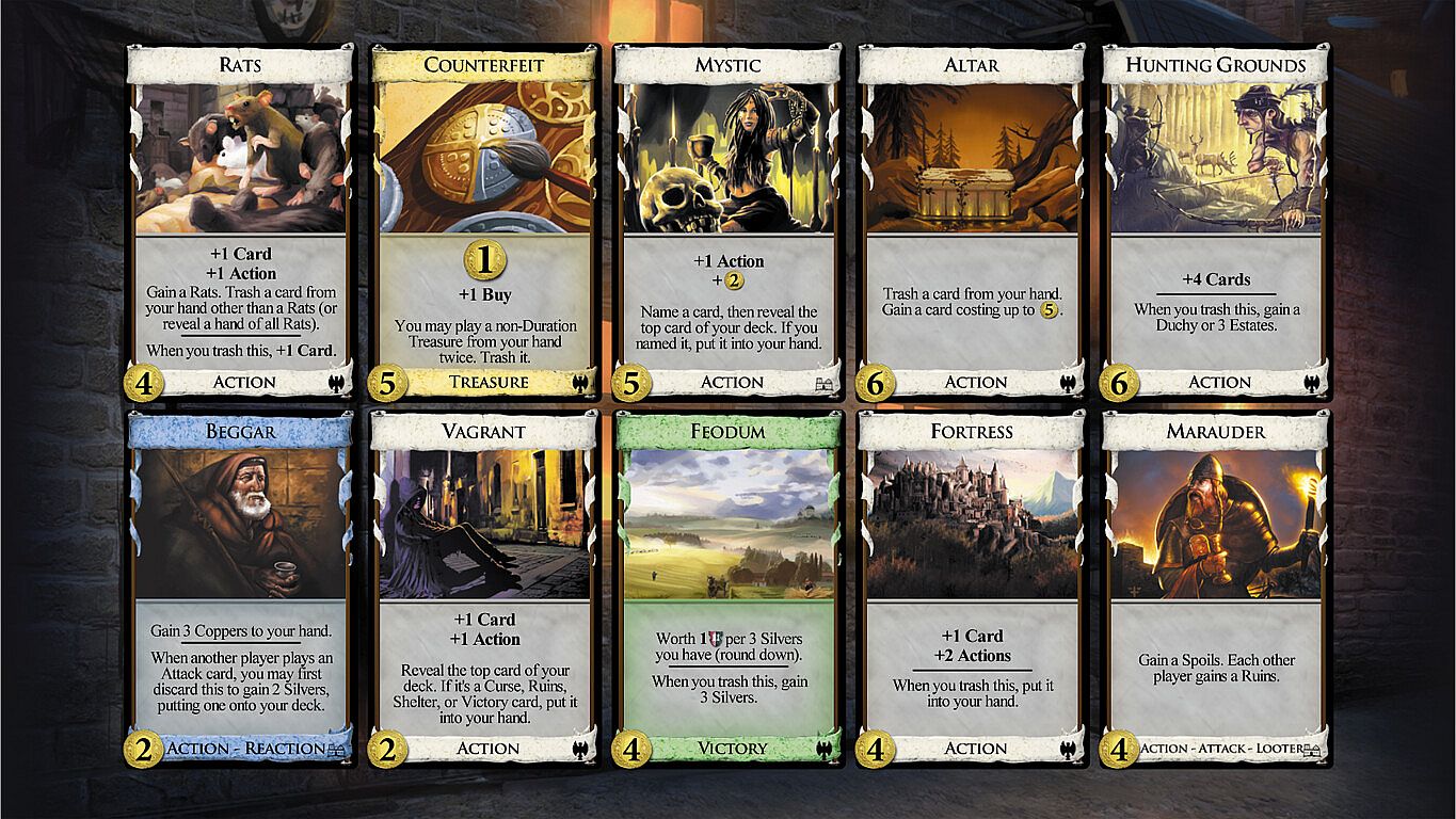 Ruins are only included in the Supply if a card with the Looter type is present in the Kingdom. These also form a varied pile, of which only the top card may be bought or looked at.