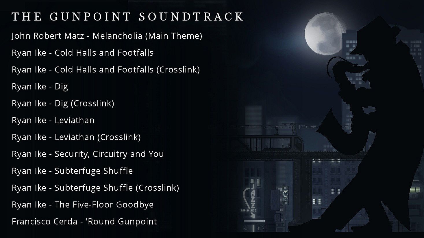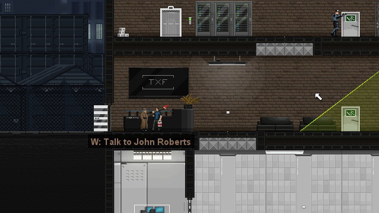 • Developer Commentary: When enabled, you'll find little sprites of Gunpoint's developers on every mission. Talk to us to hear a little about our thinking behind the design (Tom), the art (John), and the music (Ryan).