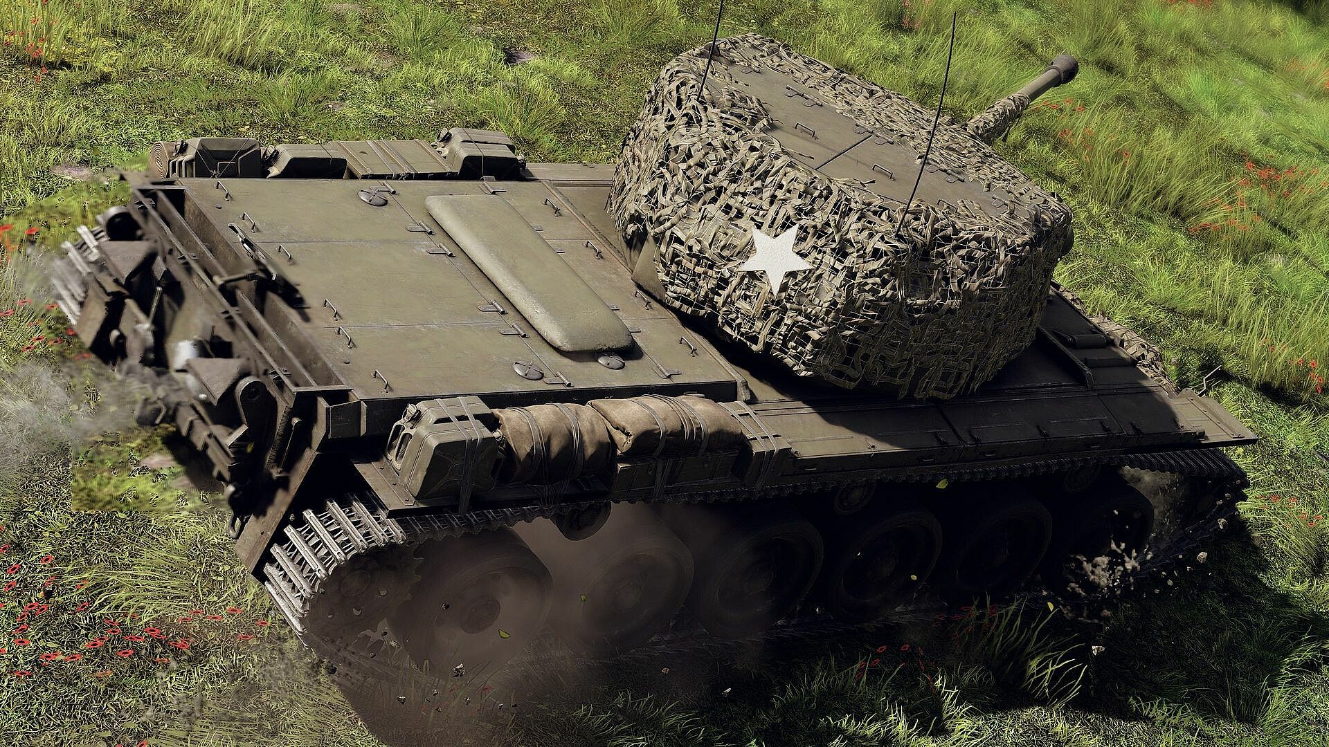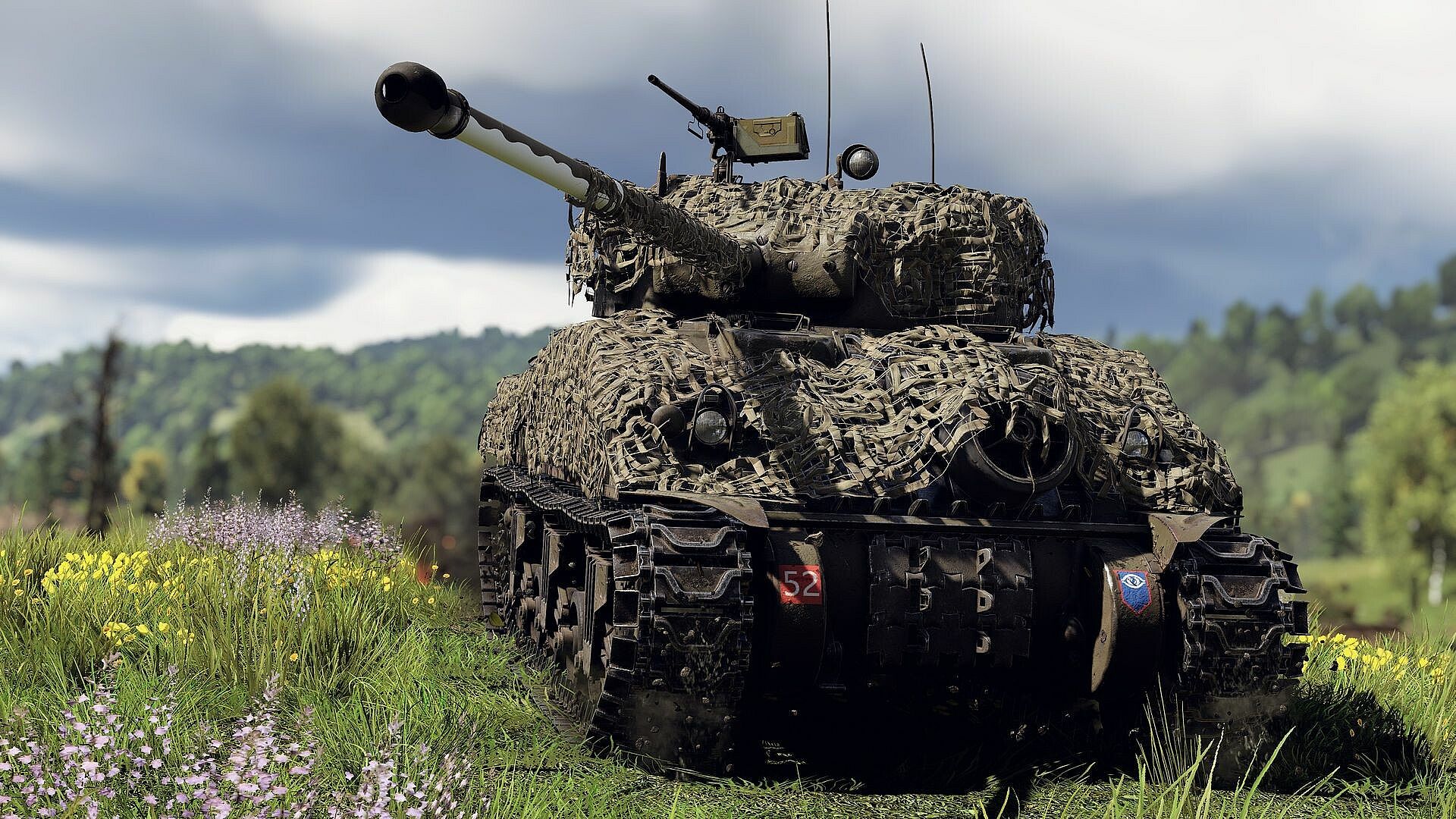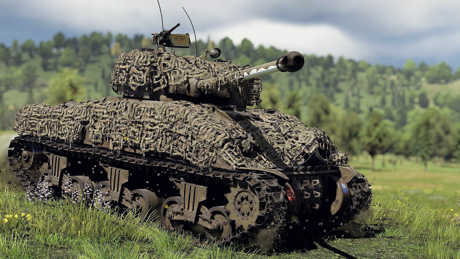 A classic British modification of the American Sherman, equipped with a long-barreled 17-pounder gun鈥攐ne of the most powerful Allied anti-tank weapons of the war. This Firefly variant features mounted track links, including captured German ones affixed to the front hull. The vehicle is also fitted with a two-tone camouflage net draped over the hull and turret.