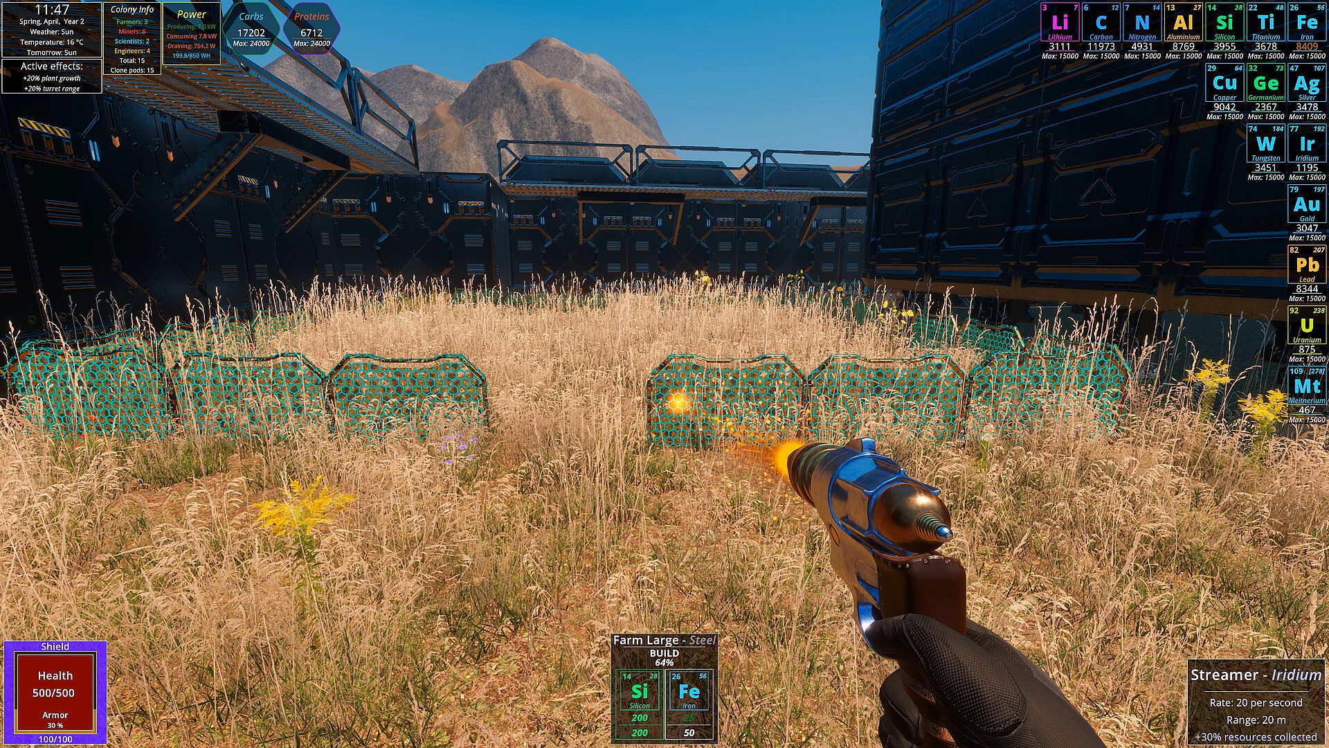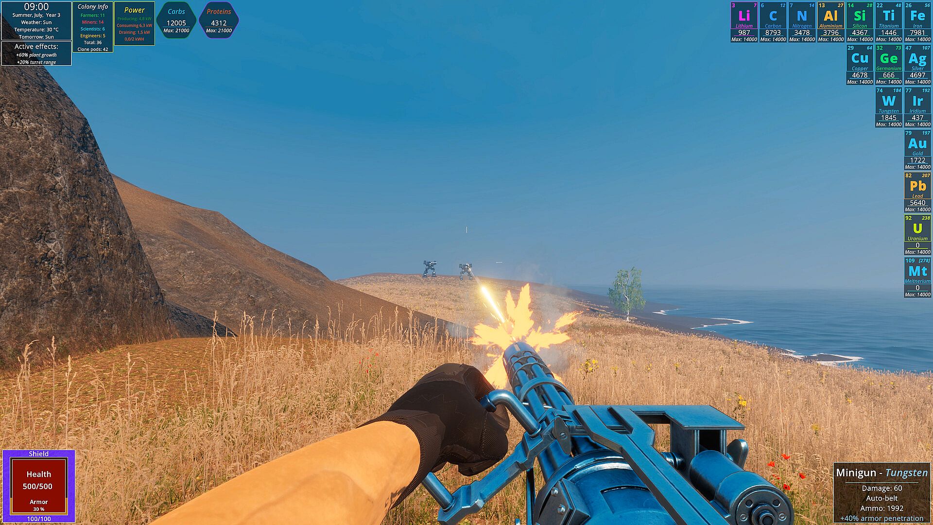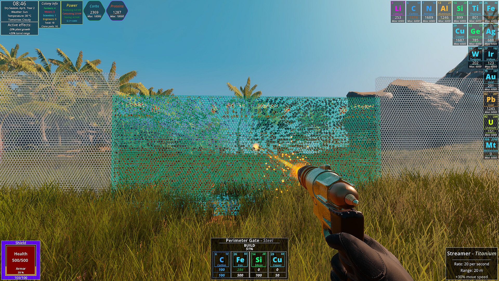 Seven metals (iron, copper, titanium, silver, tungsten, gold, and iridium) alter the properties of weapons, turrets, and other buildables crafted from them.