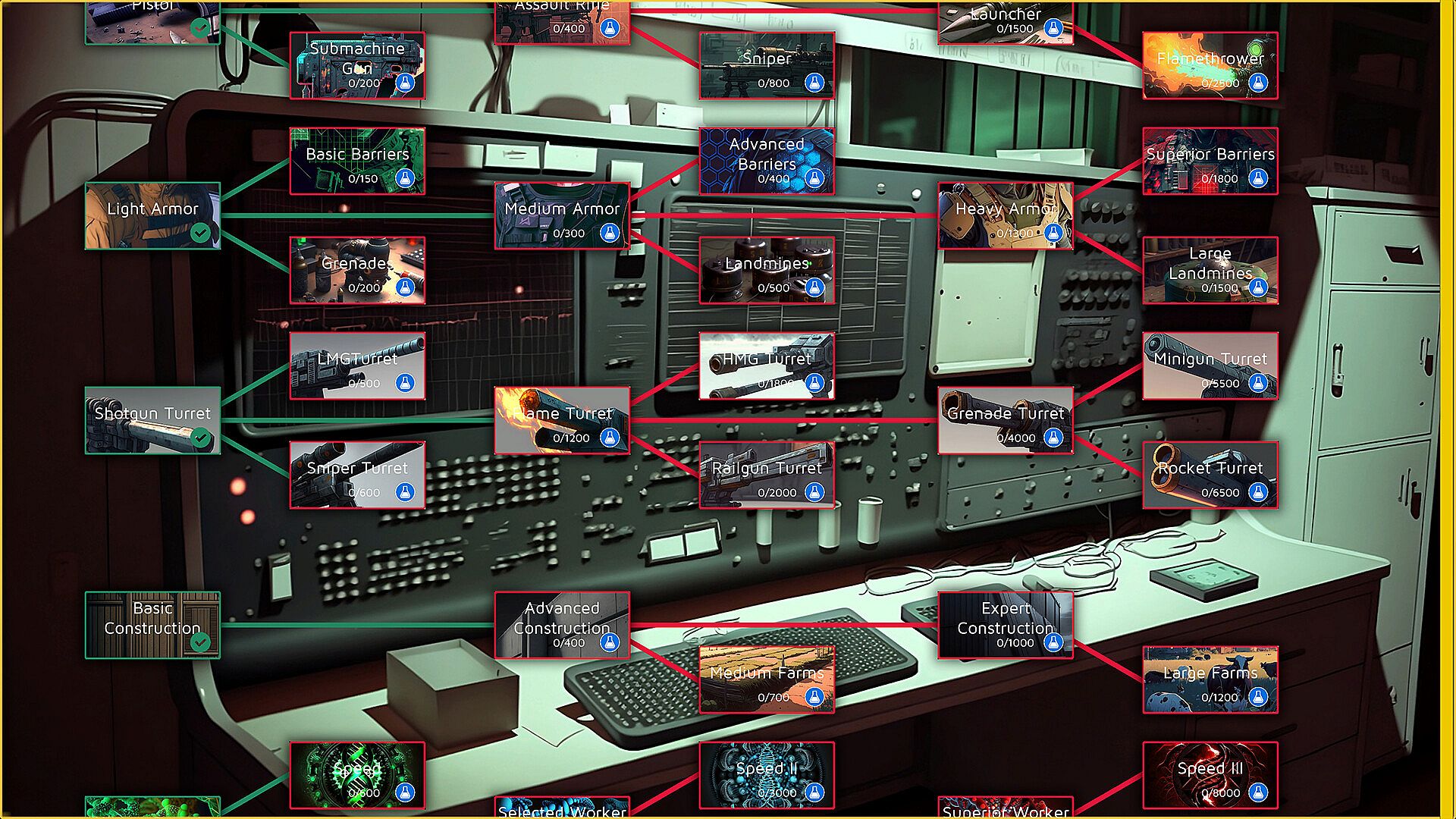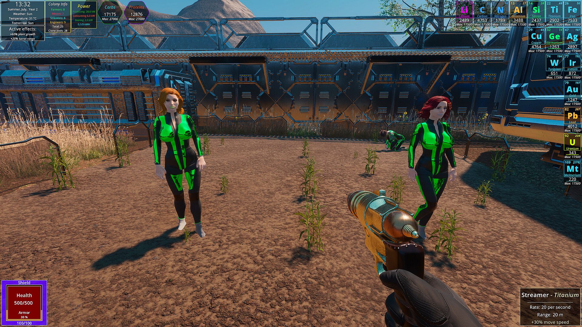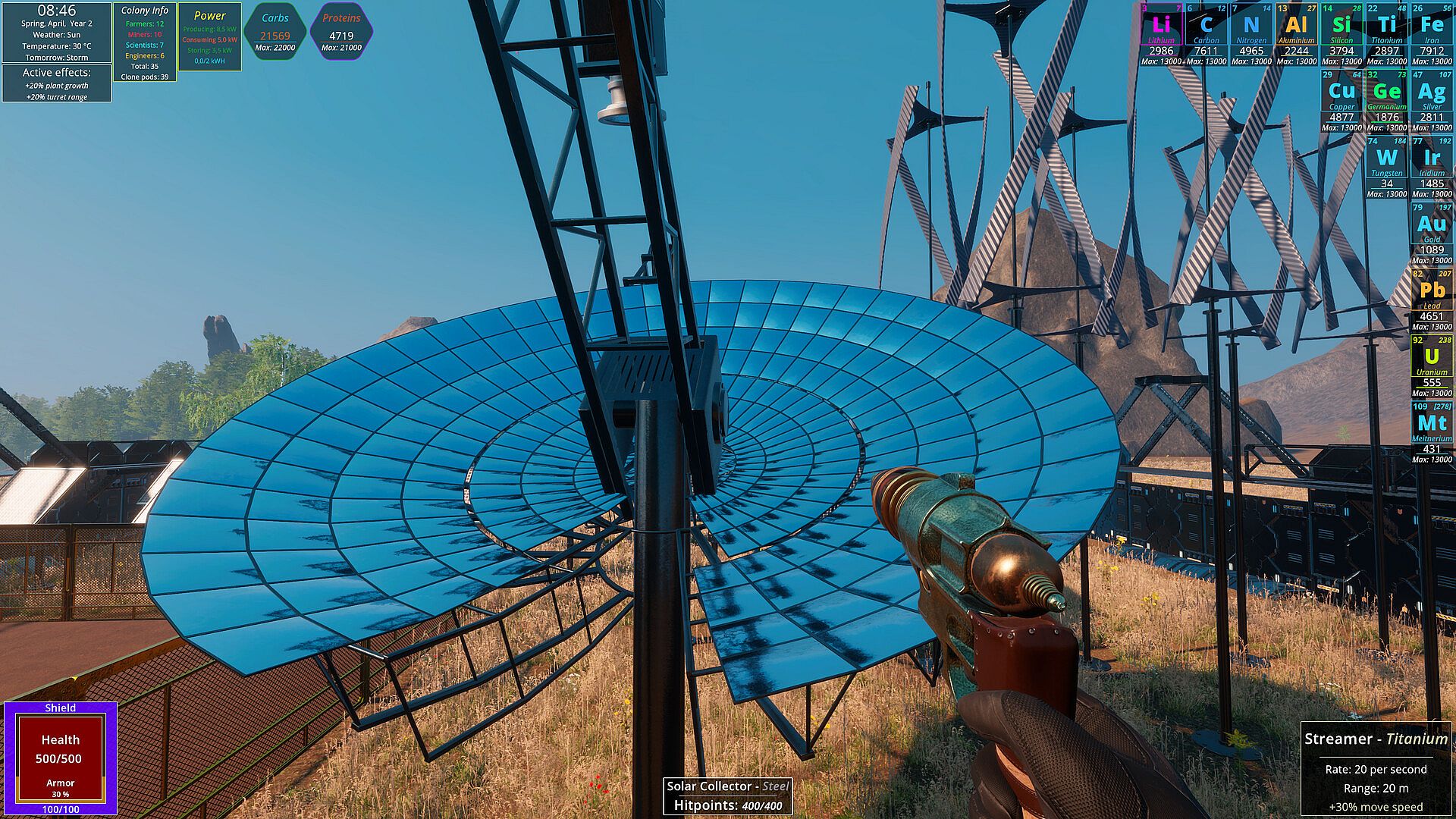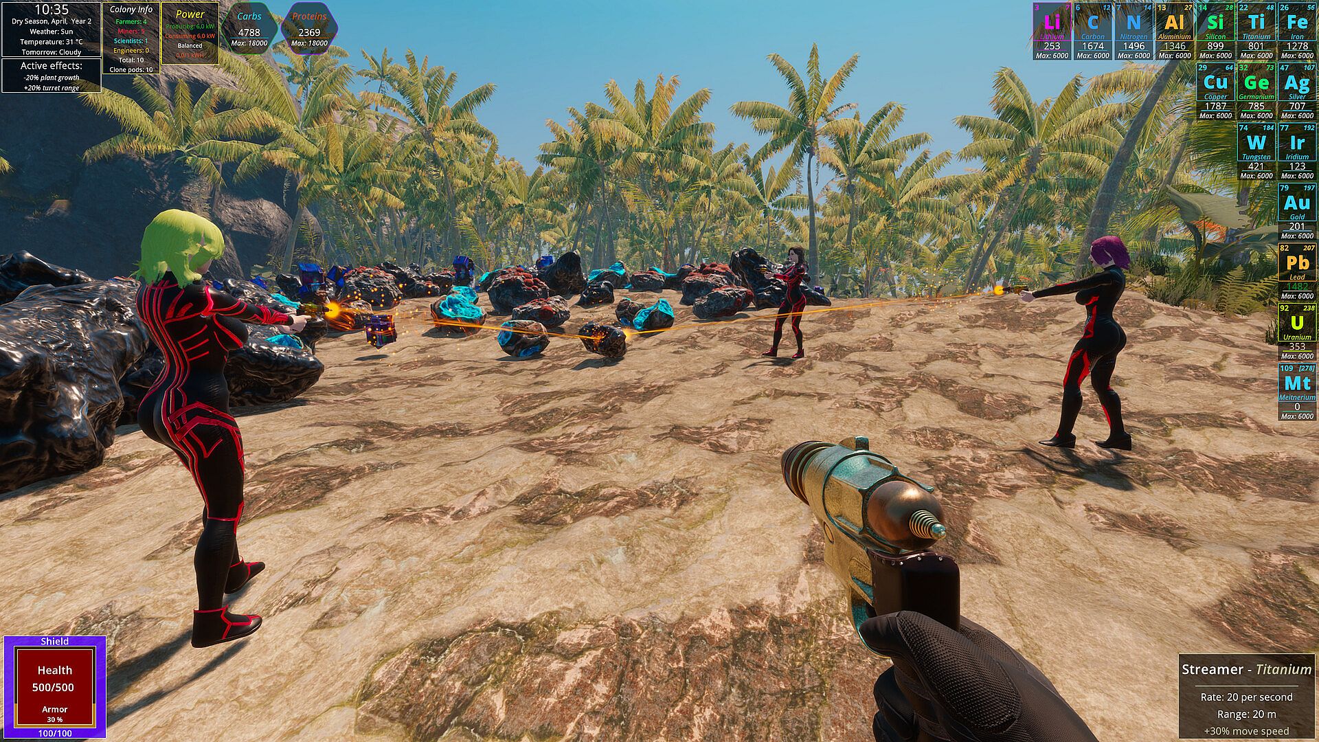 Seven metals (iron, copper, titanium, silver, tungsten, gold, and iridium) alter the properties of weapons, turrets, and other buildables crafted from them.