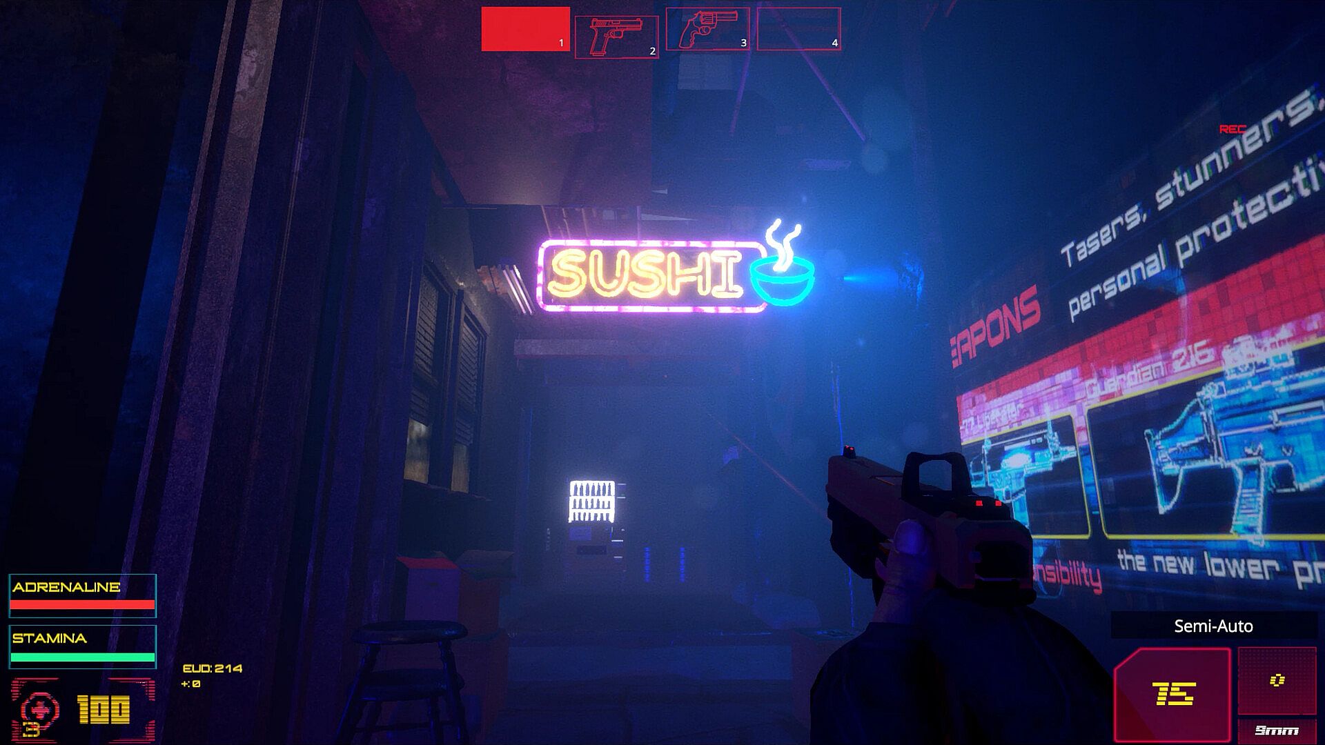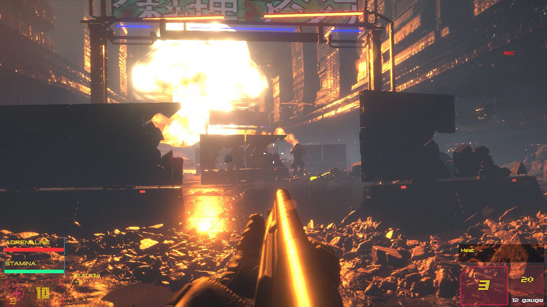 • A beefy arsenal. Ranging from small caliber pistols with red laser aim, to heavy duty miniguns. Along with a supercharged kick which will smash enemies through the environment.