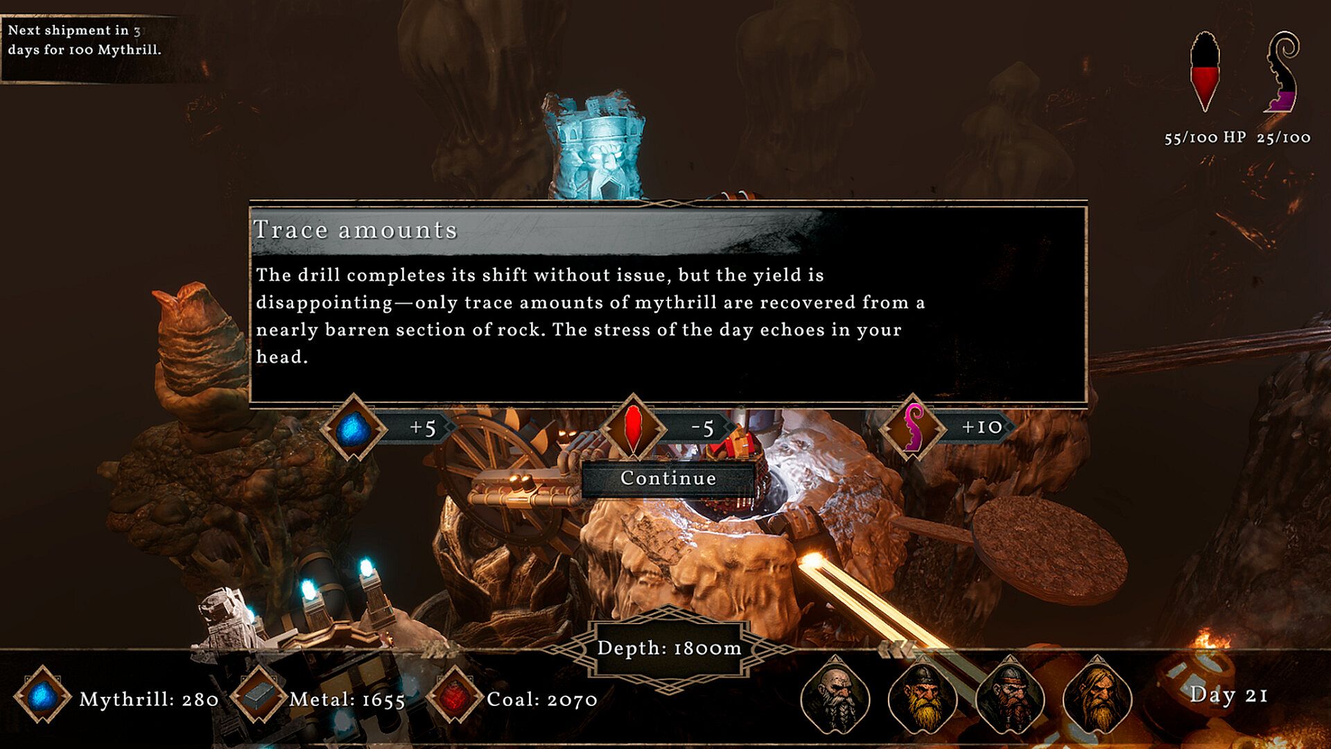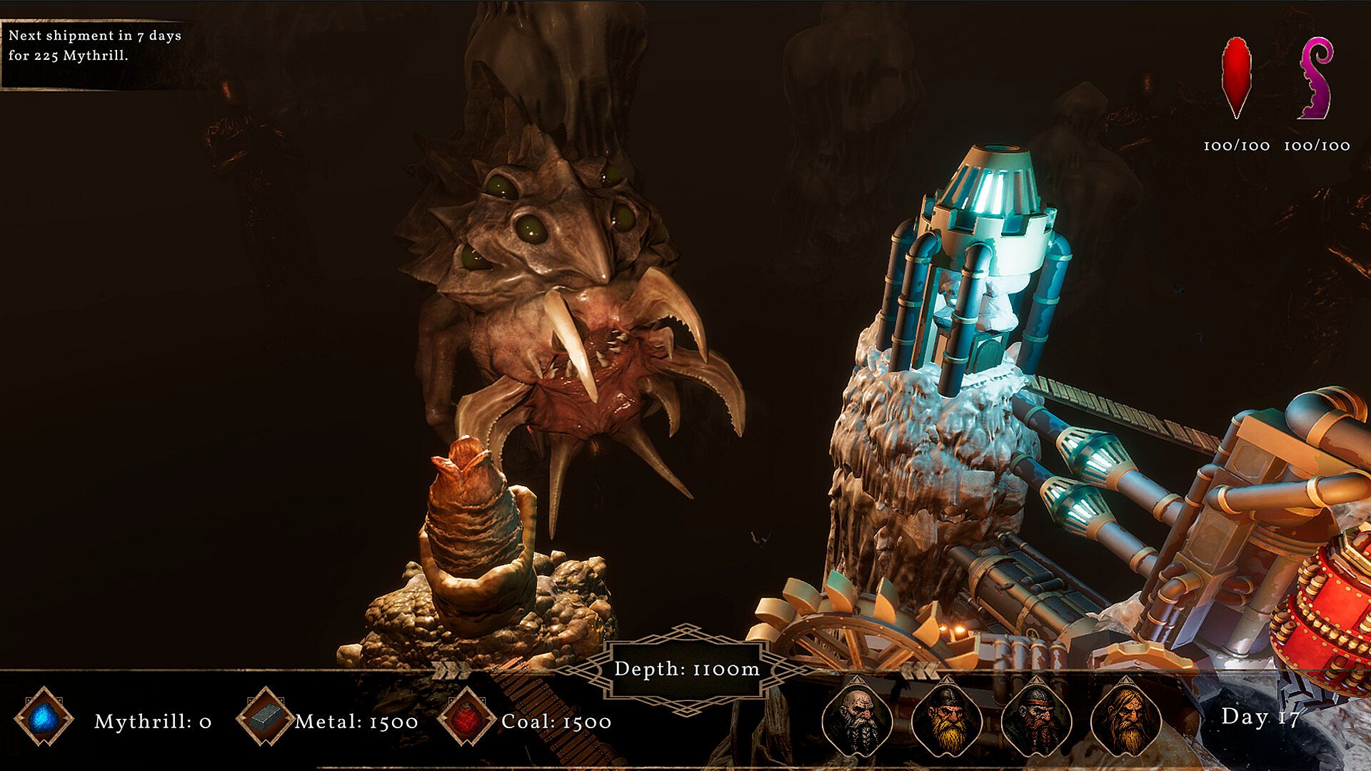 The deeper you drill the more your madness will rise, beware of the depths. There are creatures that will use your madness to locate your outpost and if that happens no amount of Mythril will appease them.