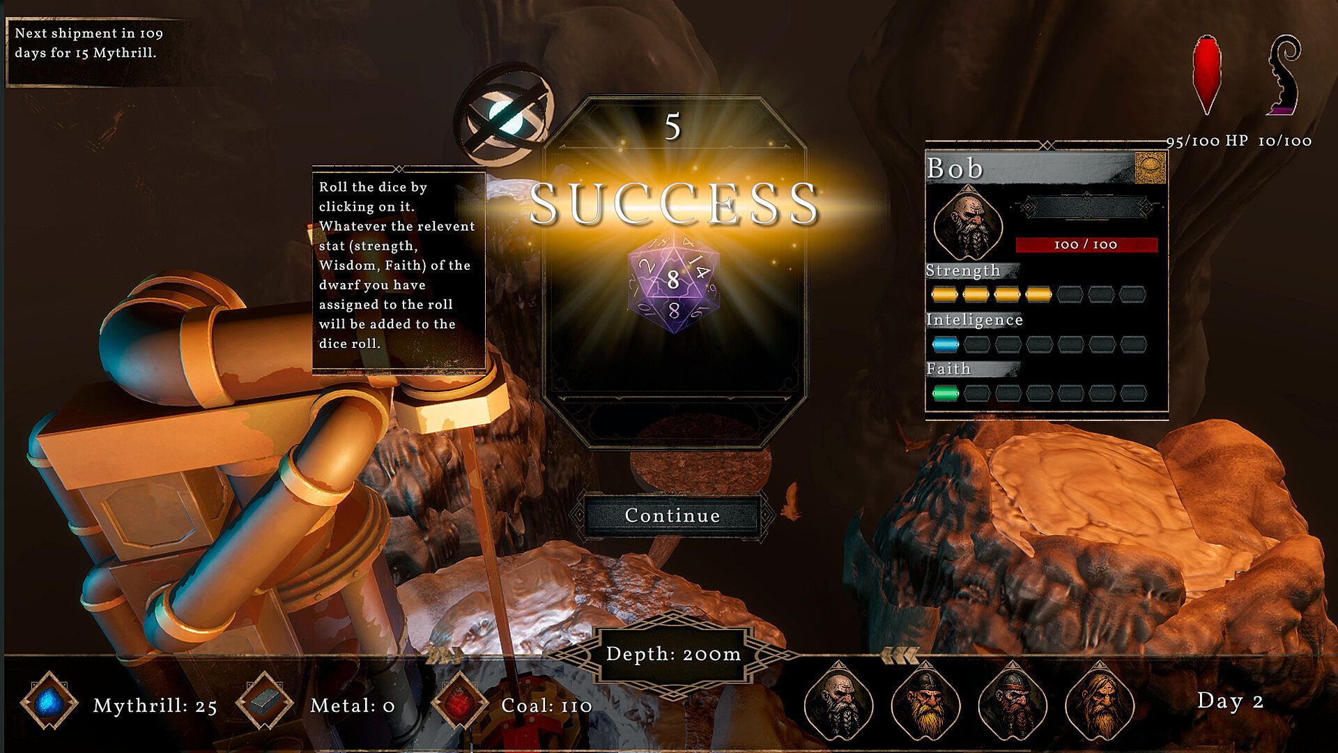 When you send dwarfs to events their stats will act as a modifier on the dice. Make strategic decisions on who you send as if their health drops too low or they go mad the outpost will be doomed.