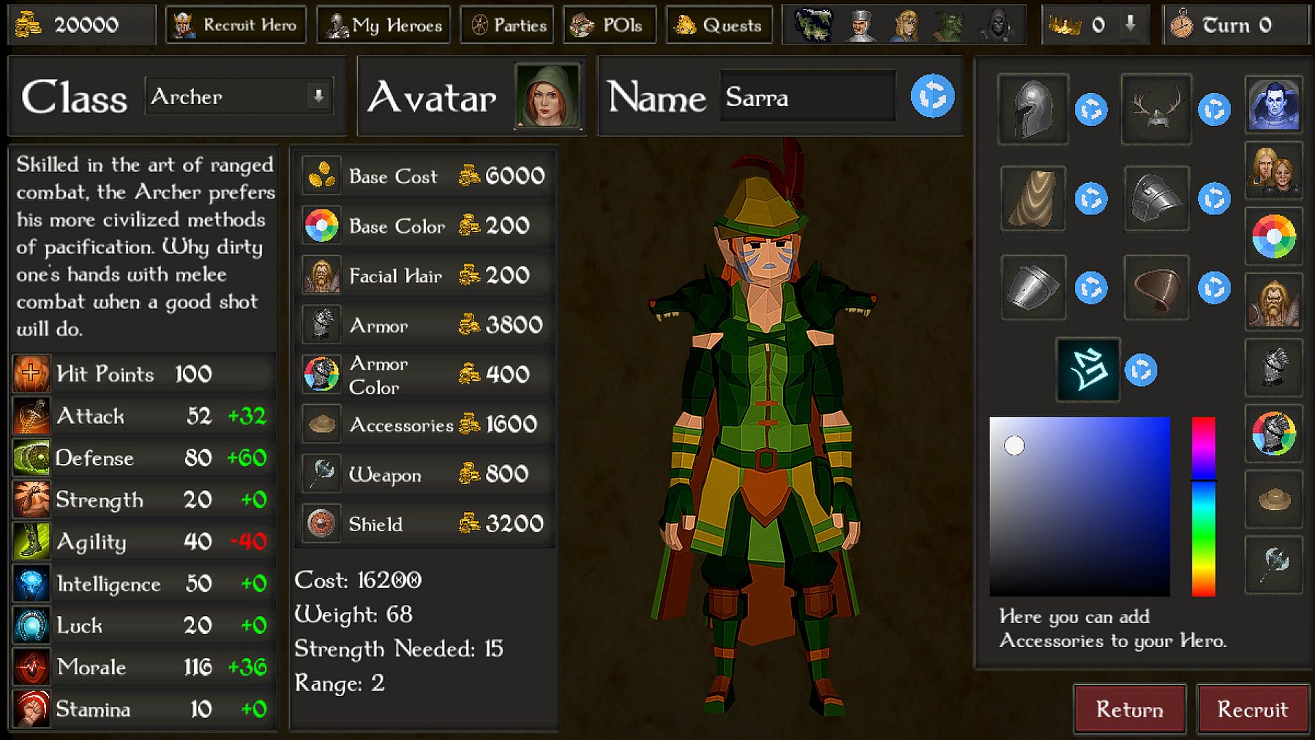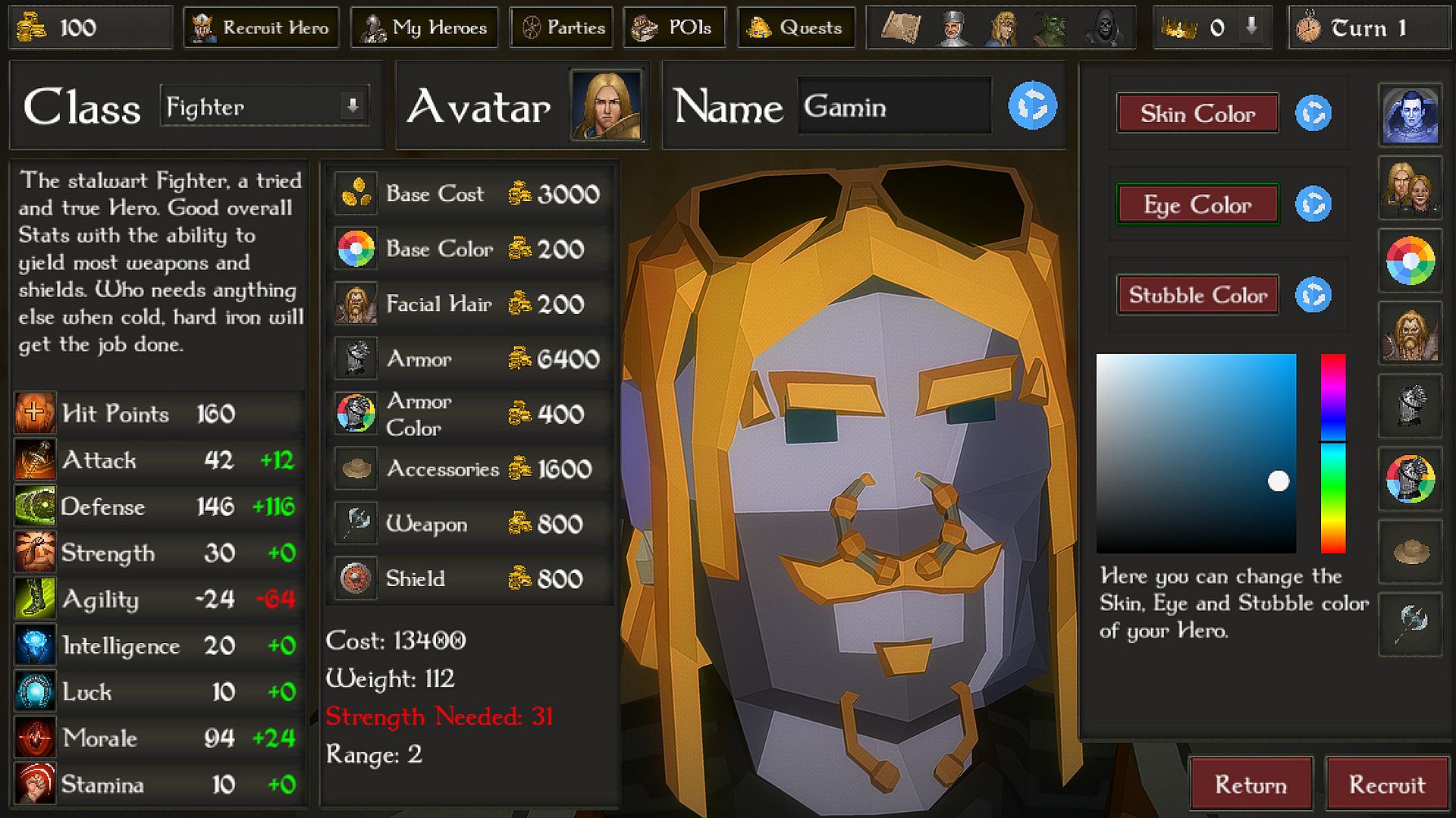 - Change skin color, facial hair color, eye color and armor color along with other color options