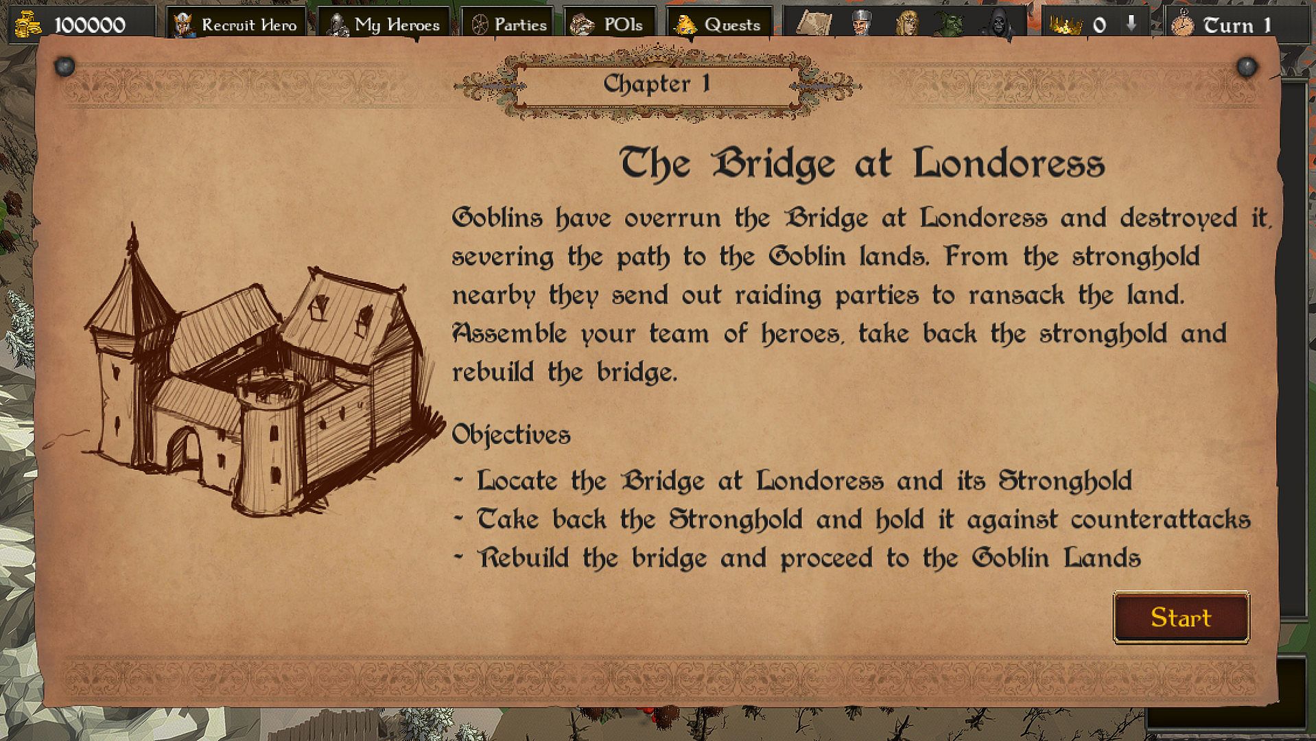 Goblins have overrun the Bridge at Londoress and destroyed it, severing the path to the Goblin lands. From the stronghold nearby they send out raiding parties to ransack the land. Assemble your team of heroes, take back the stronghold and rebuild the bridge.The Goblin Ambassador