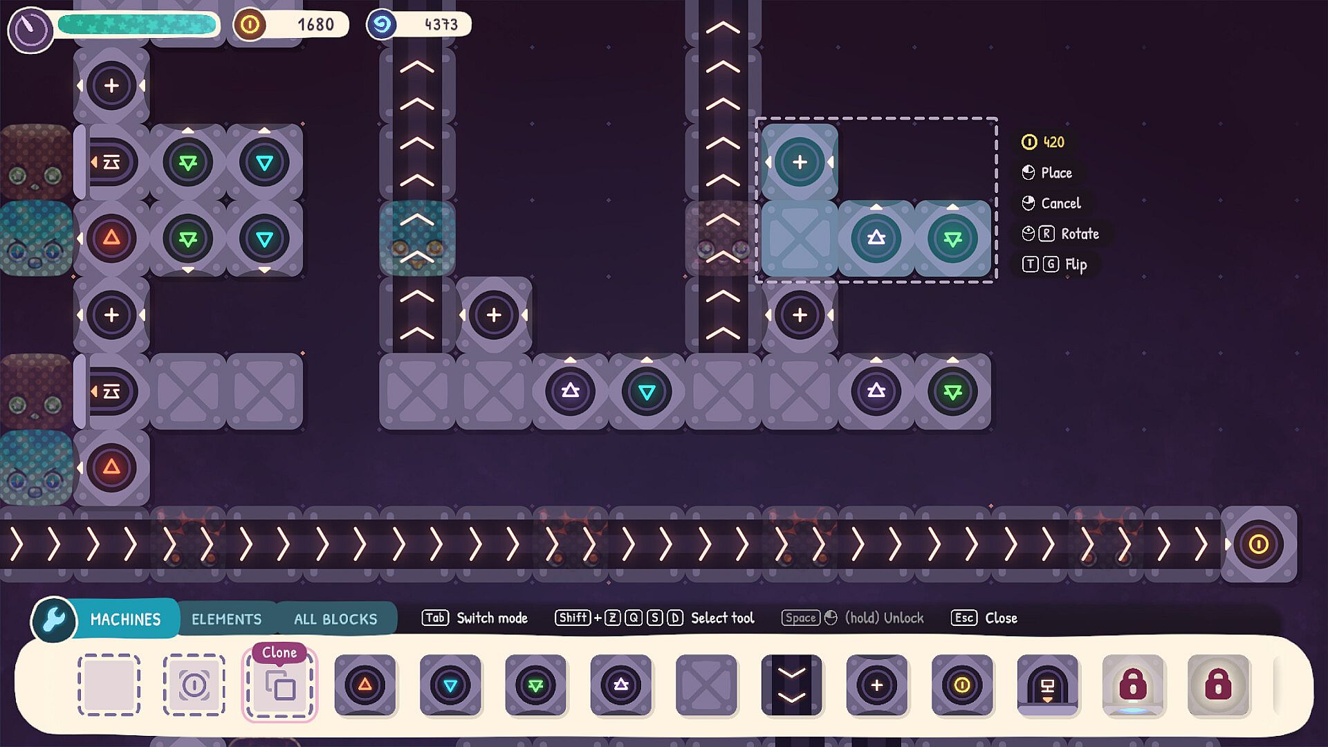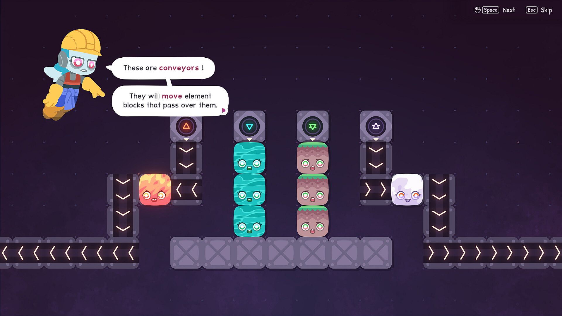 Machine blocks will allow you to automate your element-crafting operation. Combiners, programmable pushers, conveyor belts... Place as many of them as your finances will allow, and watch them work in your stead! The function of each machine can be understood in an instant, and combining them into sprawling production lines will soon be second nature!