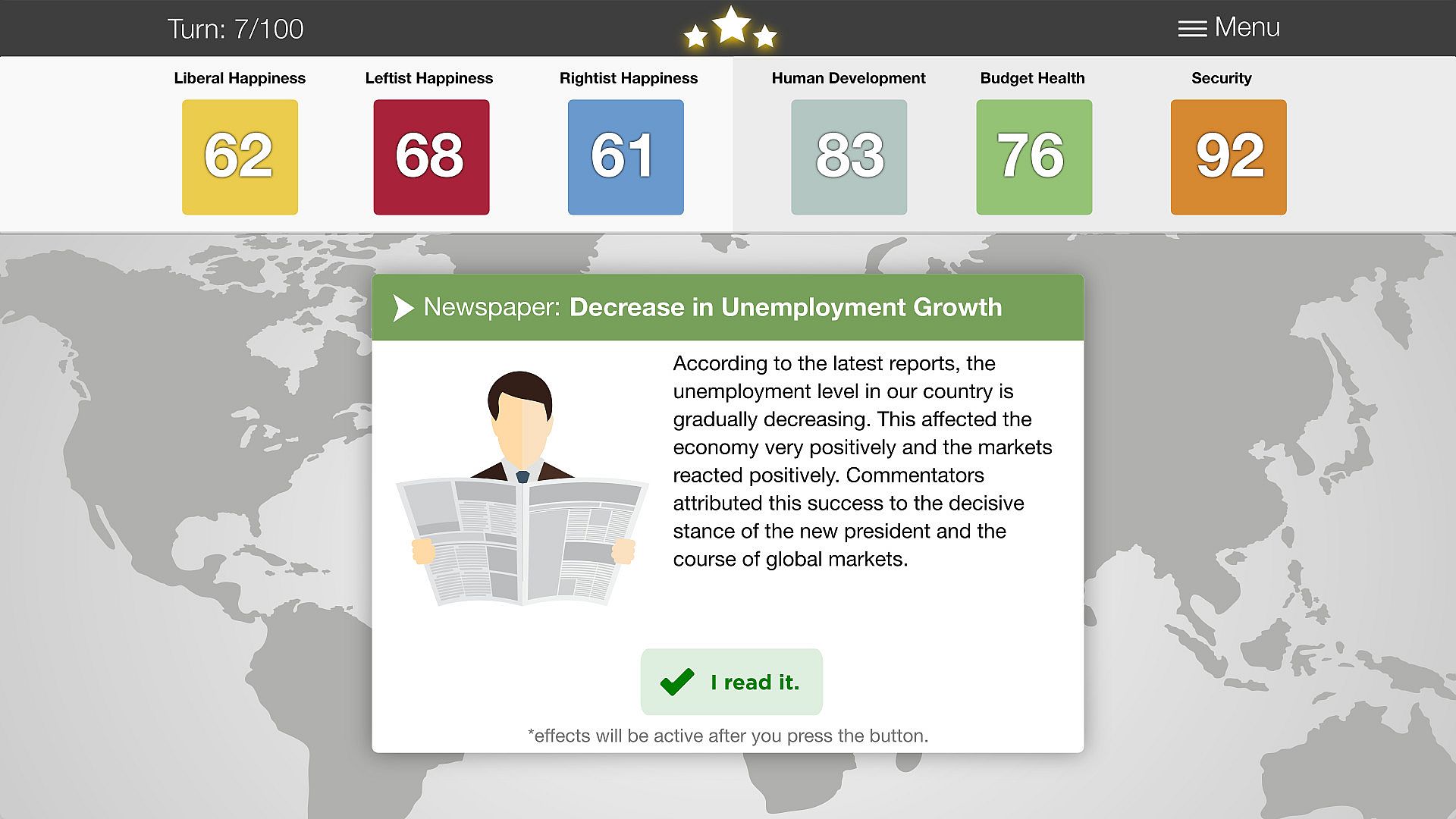 - Use the event and newspaper system: Follow the news of your country and make the right decisions based on what is happening.