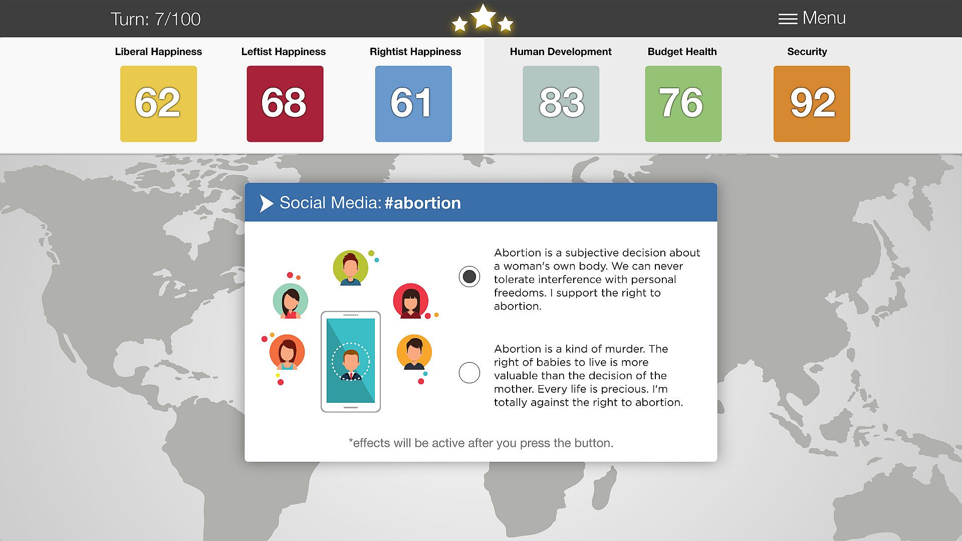 - Make important decisions: Various issues such as death penalty, compulsory military service, abortion law, health system, military budget, LGBT rights, immigration policies, tax system and much more... There are approximately 100 problems that need to be solved.