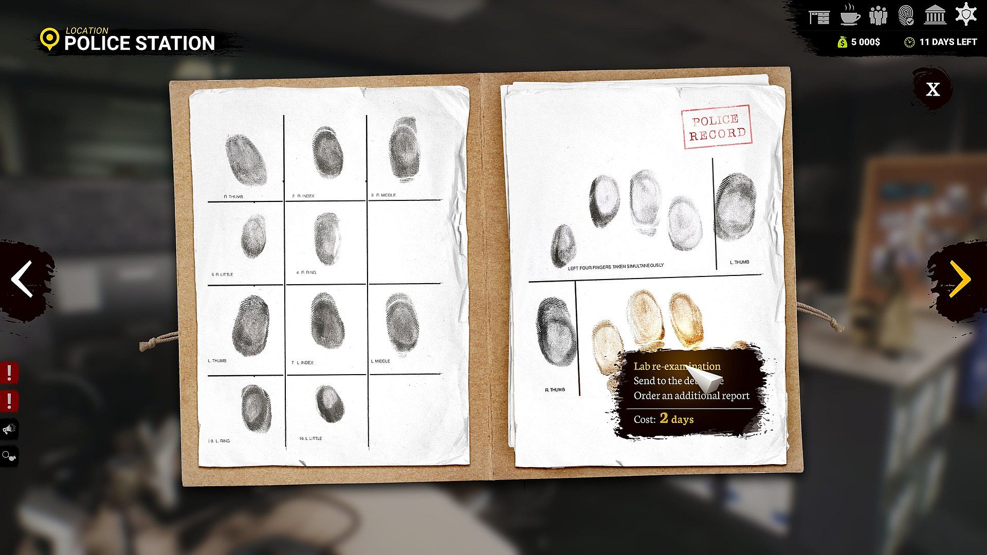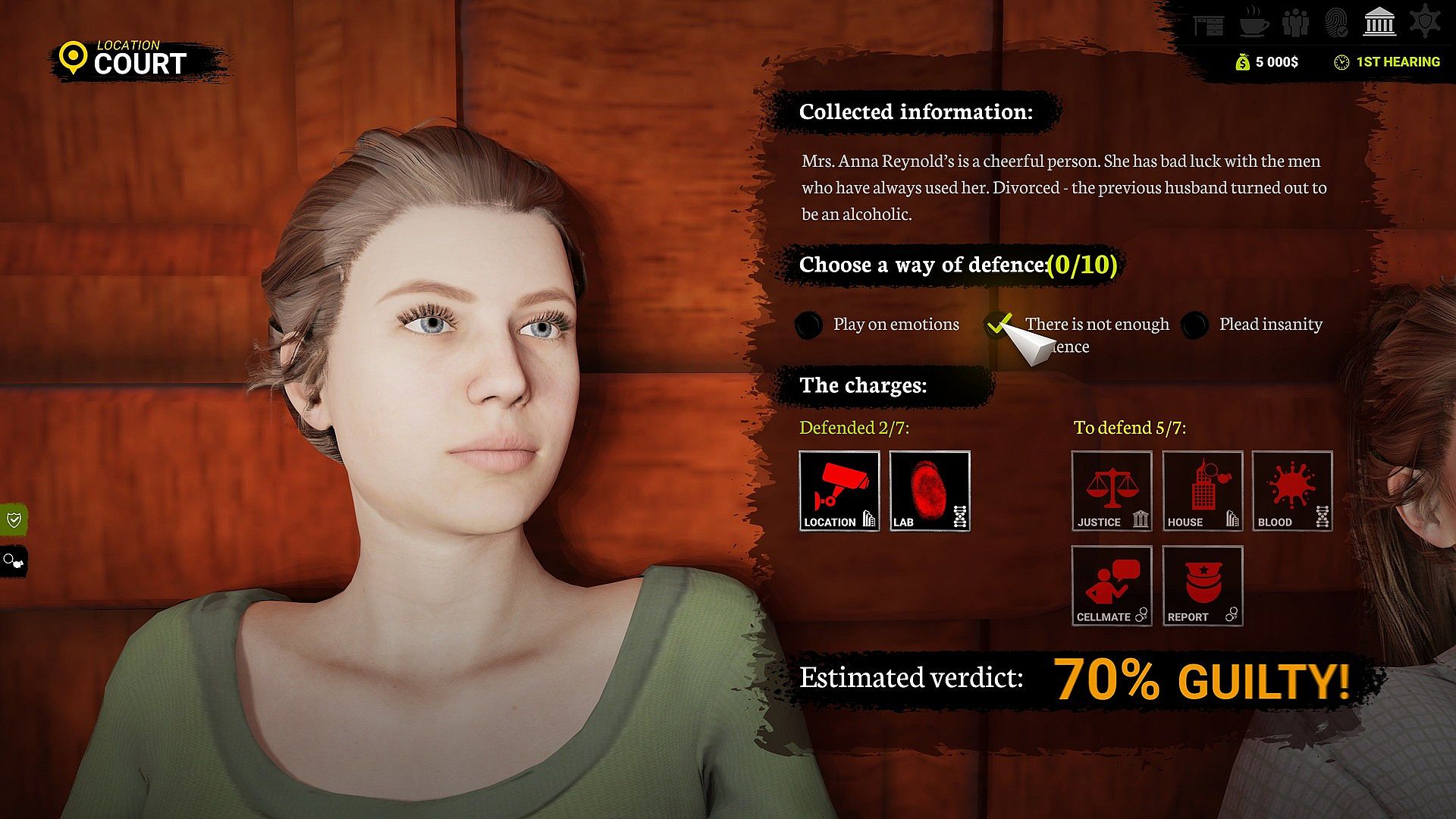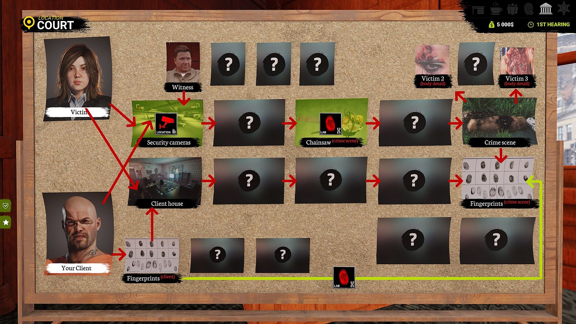 Speak with your client - find out where he was on the day of the crime. You have a range of tools at your disposal such as audio recordings, crime scene photos, fingerprints, etc. to get to the truth. The interrogation will lead you to interesting, unexplored details of the case.