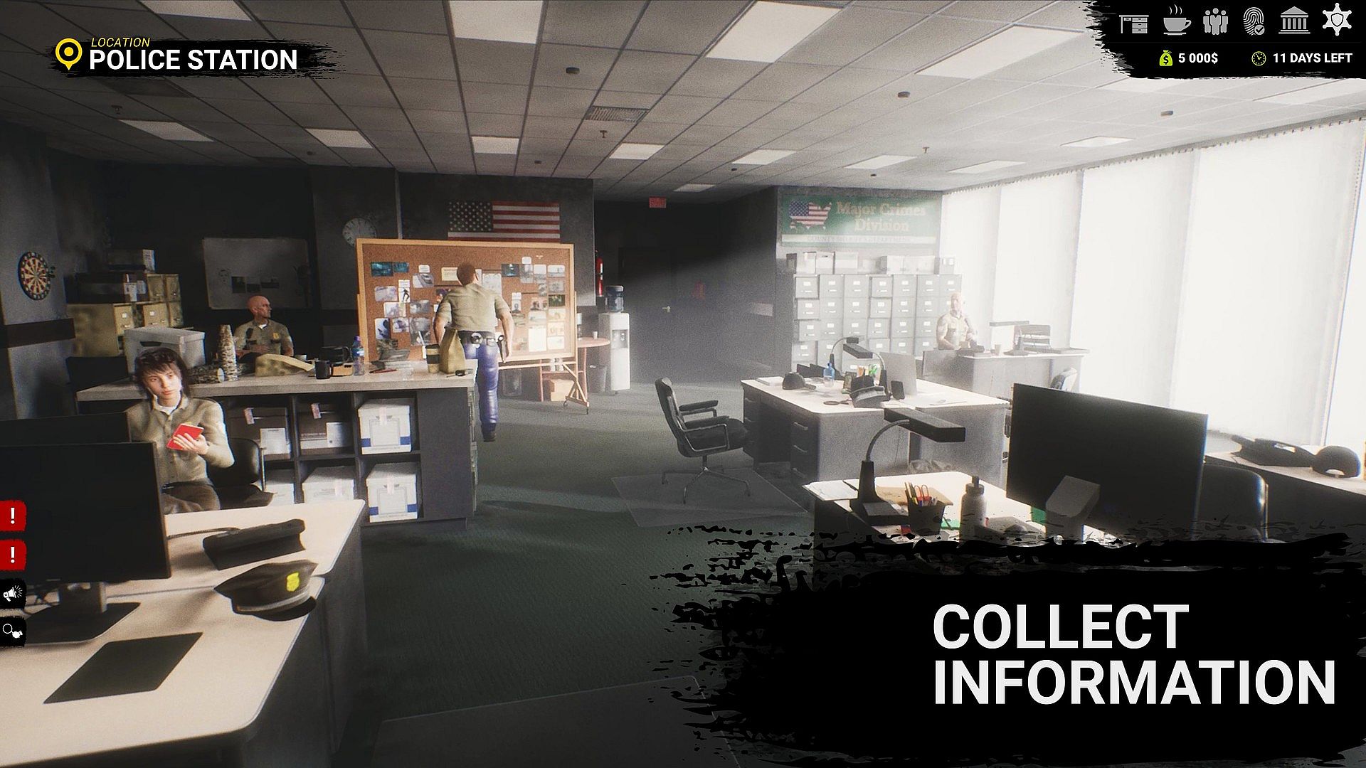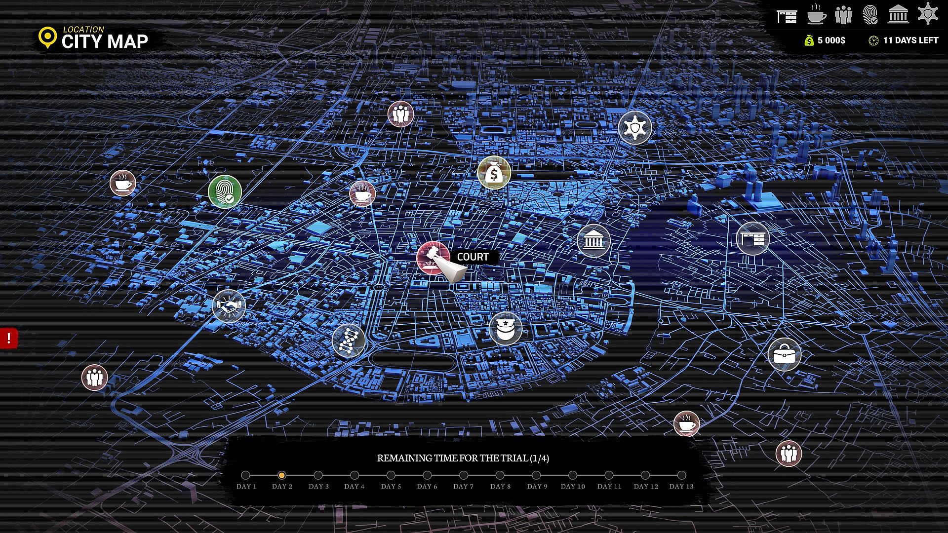 Move around the town and obtain information and evidence of the case. You have at your disposal places such as a police station, a restaurant where lawyers meet, a laboratory, offices and other places where you can find people useful in this matter.