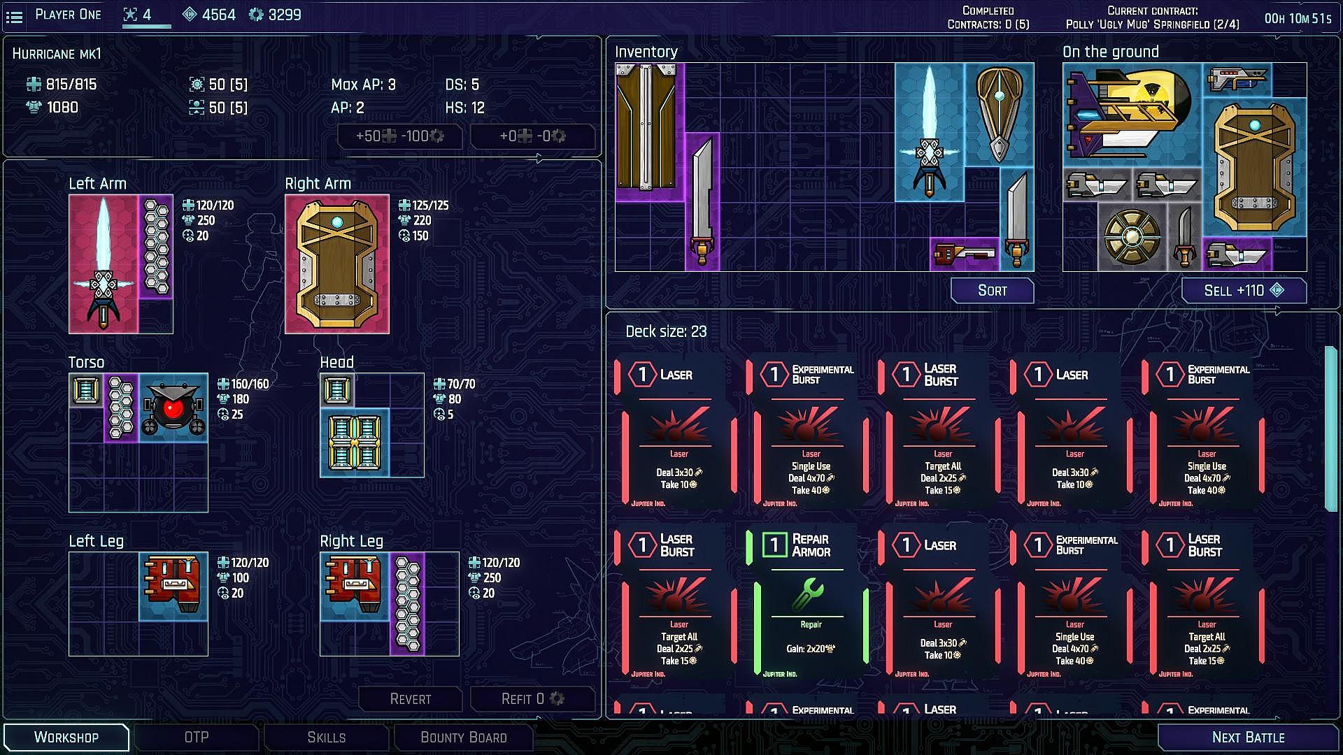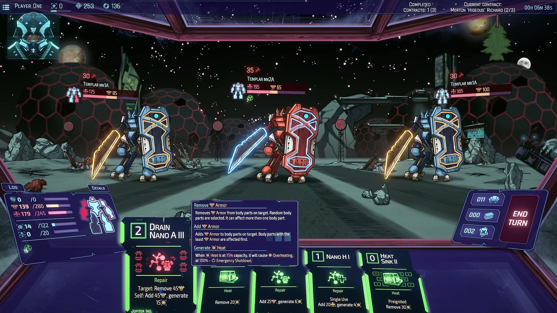 Each body part of the Mech has its own armor and health. Balance your equipment to keep your deck efficient and provide enough protection. When a body part is destroyed, you can’t play cards attached to it!