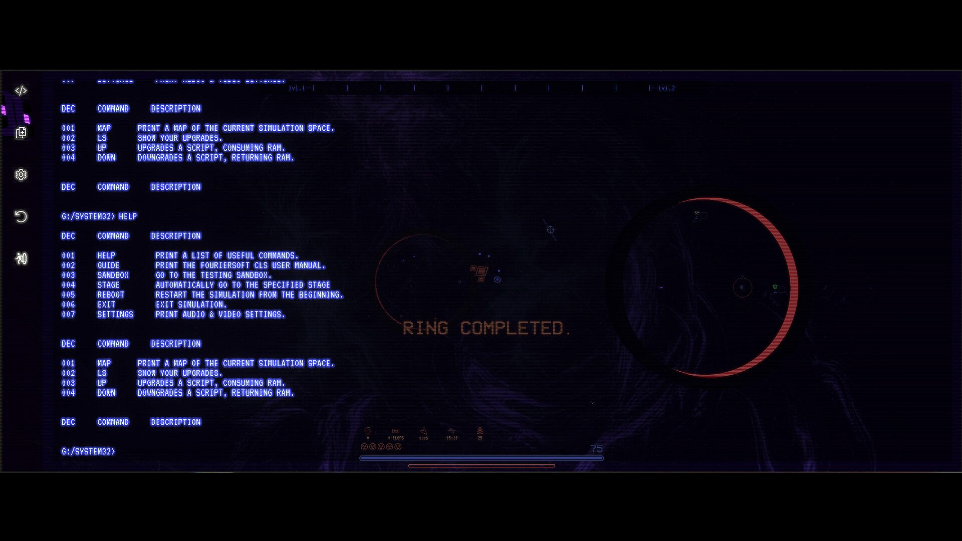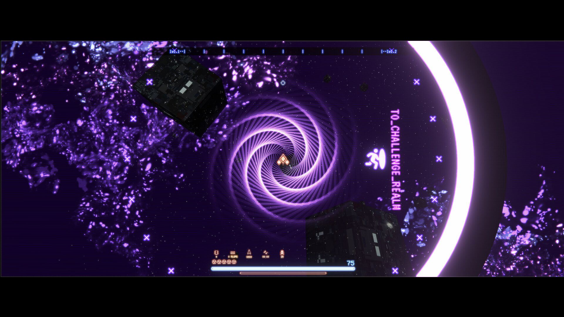 Gameplay involves switching between fast-paced bullet-hell action and use of a retro terminal in order to alter the battlefield, and your character.