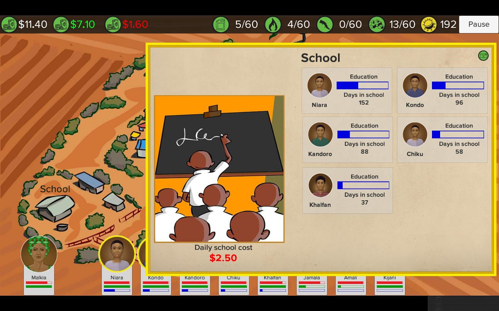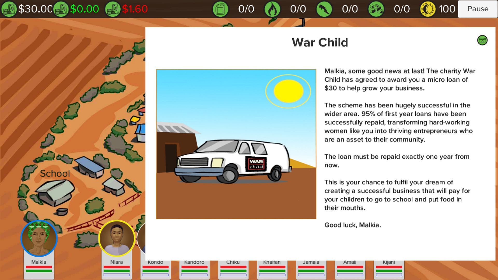 Your job is to assist Malkia as much as possible by utilising the resources available to her. By successfully delegating tasks amongst the family and completing stock resupply journeys you can help Malika to grow her business, educate her children and put food on her family's table.