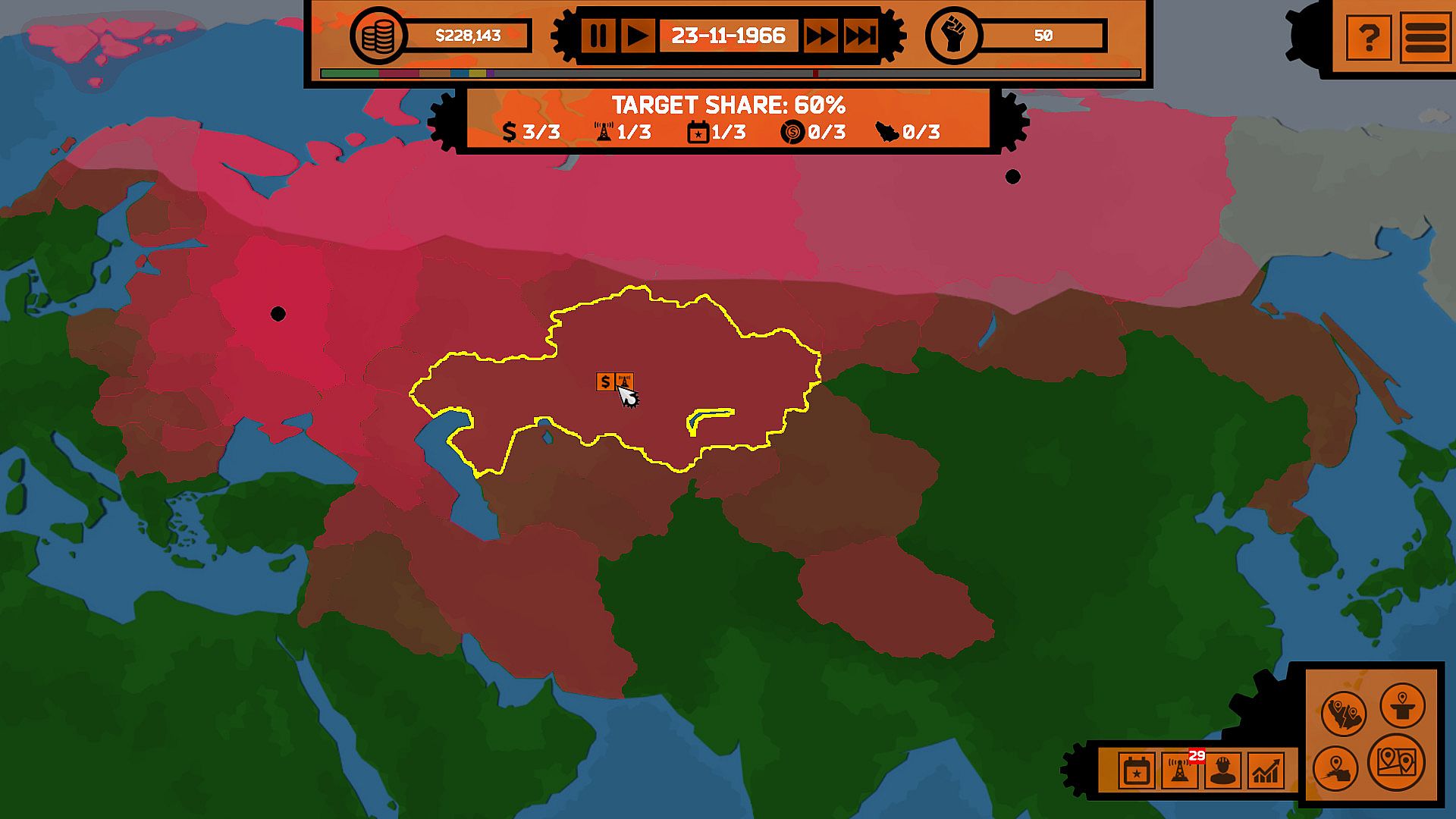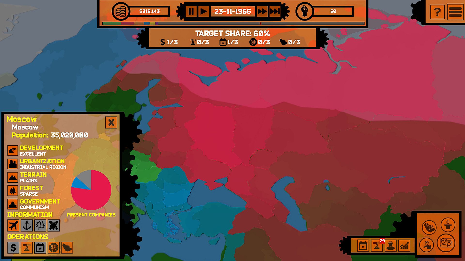 The Cold War quietly rages on around the world as tensions rise between states. During these turbulent times, you are tasked as the CEO of a new, enterprising company. Can you overcome obstacles to become a burgeoning company and dominate the market?