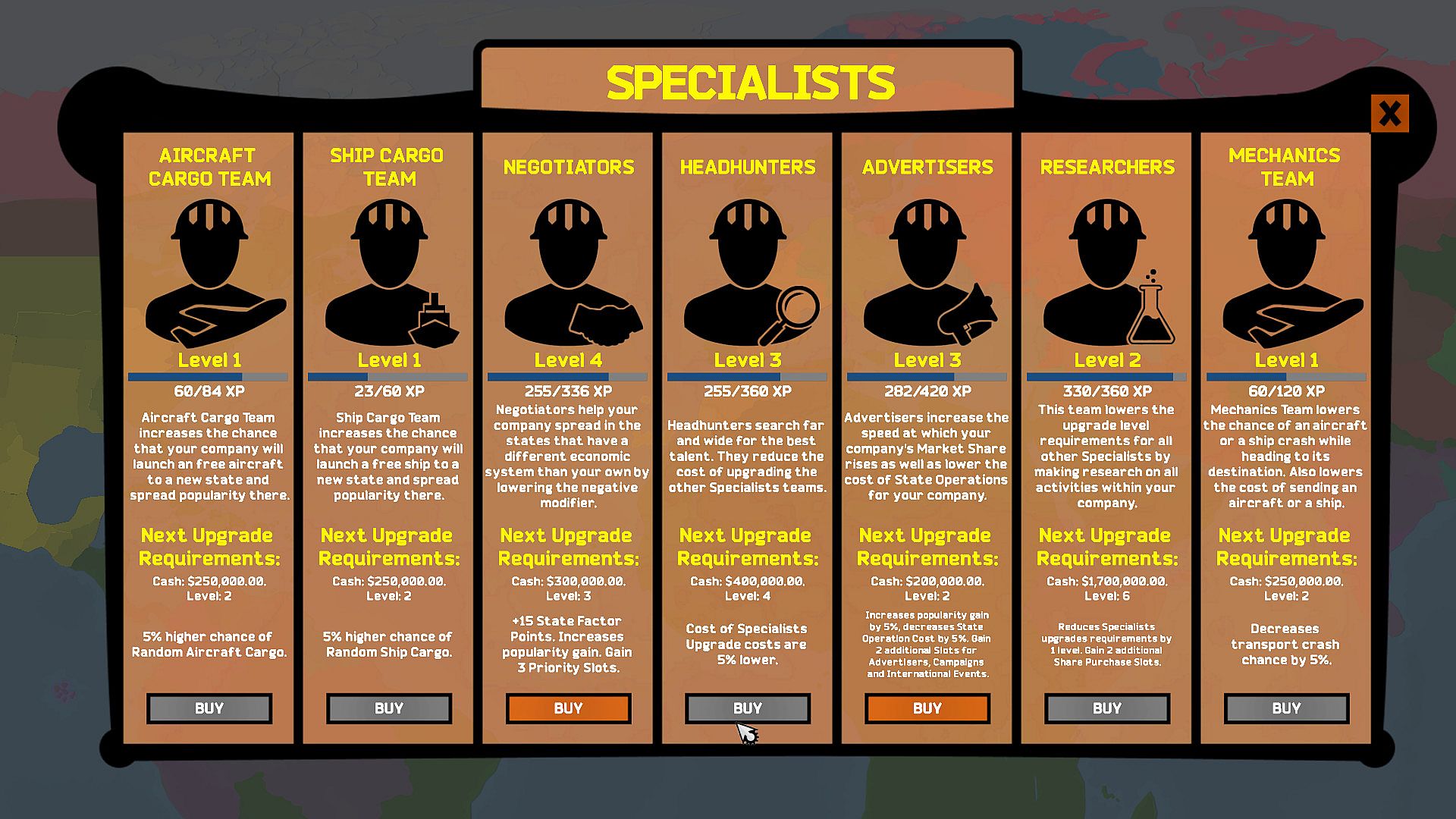 • Specialists - Companies hire Specialists all the time - whether they are advertisement masters or slick negotiators, they are all indispensable. In Market Dominion, you can use them as an ace up your sleeve and surprise your opponents.