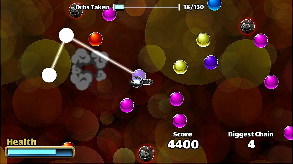 But the challenge lies in your ability to target the right orbs and accurately touch them in succession! There is no grid. The orbs are floating around. Collecting orbs of the same color in a row will create chain combos! The bigger your chain, the bigger your reward. But all this happens in a fully seamless world packed with blocks, bombs and teleporter portals.